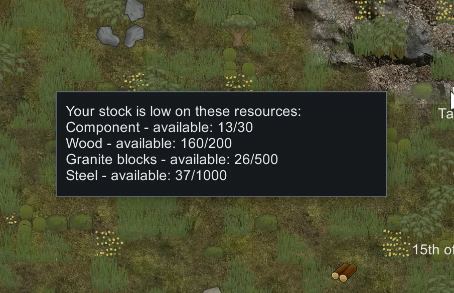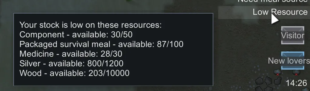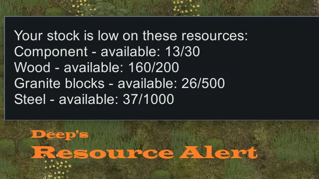 This mod adds a fully configurable alert whenever your stockpile of any resource falls below a level you choose. It installs and uninstalls cleanly and won’t interfere with other mods or your save files.
