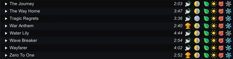 Adds 49 New Music Tracks To Rimworld That Tries to go along with Vanilla music' style. These songs Have tags for either Day or Night, Raid Trigger and Season Trigger implemented. Example; Intense Songs won't play just randomly only when triggered by an intense event either a raid or other situation, Season trigger Stops A song Meant for a Sunny Plain playing in the dead of winter and Vice Versa, Songs that are more atmospheric towards the universe are normally played at night, compared to during the day more up beat are played.