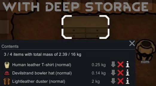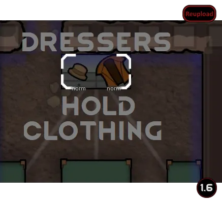Dressers and end tables are now storage. By default, they hold non-tainted apparel. They can be configured to store weapons, drugs, and textiles.