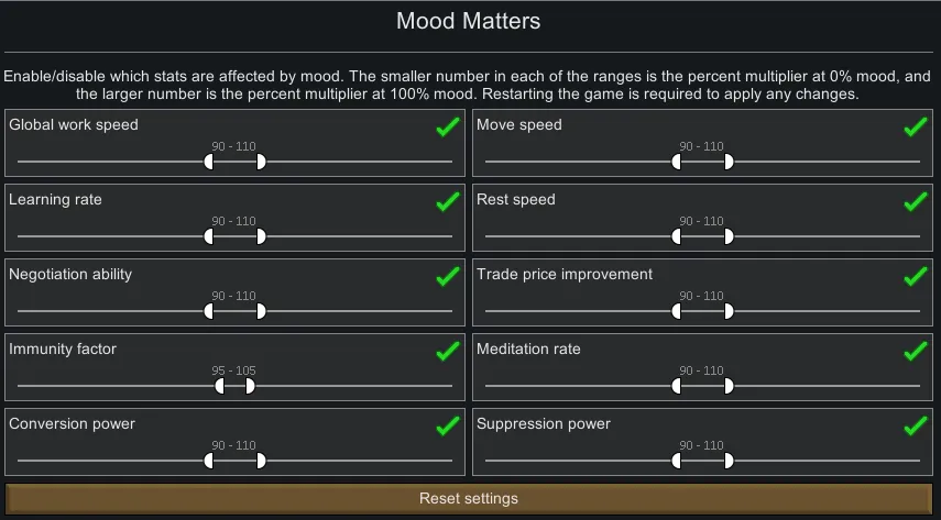 Makes various stats scale to the colonist's mood. Mood now slightly affects a colonist's general efficiency at all times, and so it is more important to manage. Low mood causes colonists to perform worse, but having high mood will give them an increase in efficiency.