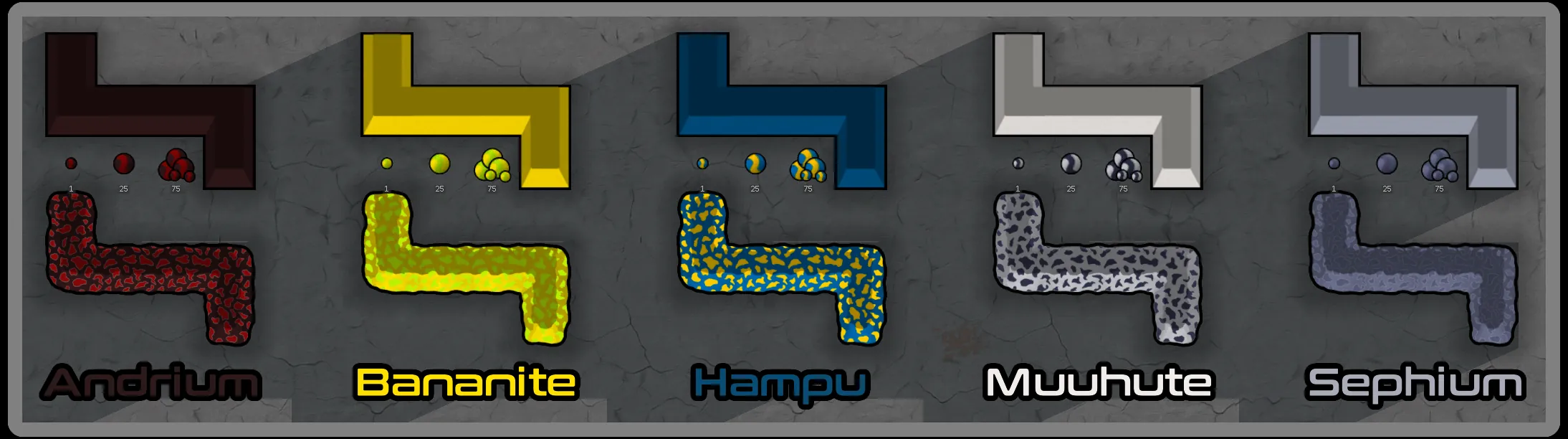 Each ore also has a color coded texture in 3 sizes, making it easier to distinguish smaller from larger stacks of ores.