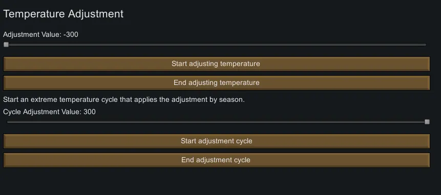 This time, it's a mod that allows you to adjust the temperature. When you enable the temperature adjustment in the [b]mod options[/b], it will create a game condition that changes the temperature by your selected value. You can end this game condition when you're bored or when everyone is dead - whichever comes first.
