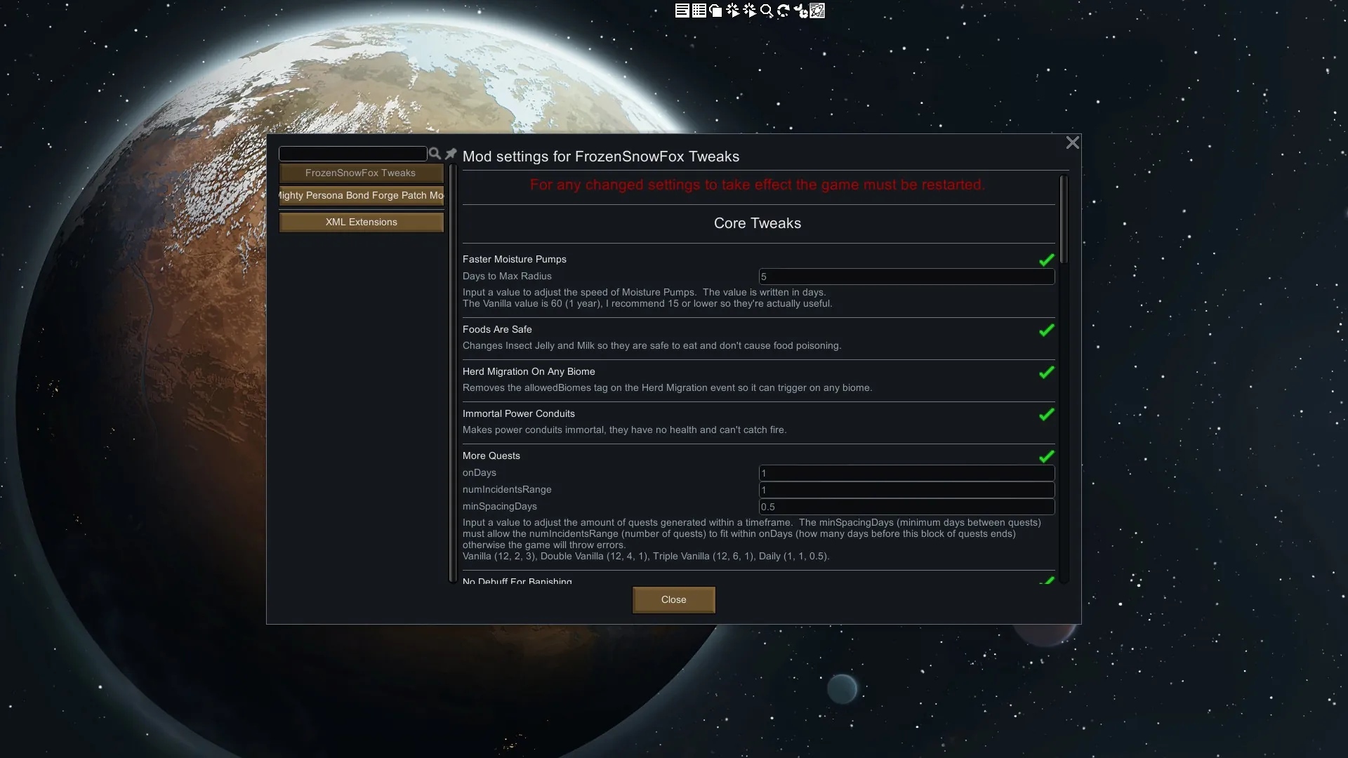 When it comes to mod support I generally support mods as I use them. I use a large selection of Vanilla and Alpha series mods so most of them should be supported. If one of my tweaks doesn't support a mod leave a comment in the thread linked below and I'll see about adding it.