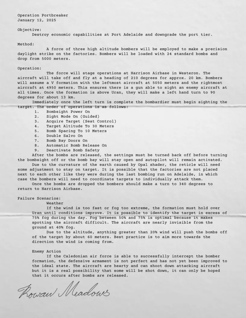 By December 30th, 2024, war had been declared against Caledonia, Guarntia, Haven, and Nedersawyer. The ULA consisted of Oceania, Rowekistan and Westeron; we were outnumbered approx. 40 vs. 30. By January 12th of the new year, it was time for the bomber to be revealed at last during Operation Portbreaker. The plan was to destroy Port Adelaide in one fell swoop, though two of the bombers missed their targets. During the mission there was resistance by heavy fighters, damaging the bomb bay doors of the lead aircraft. One of the crew, Mike, valiantly risked his life to climb on the outside of the aircraft during flight to repair the door servo. This was his last act, as he was ripped from the aircraft. That lead bomber, [i]Portbreaker[/i], went on to score the only hits of the mission.