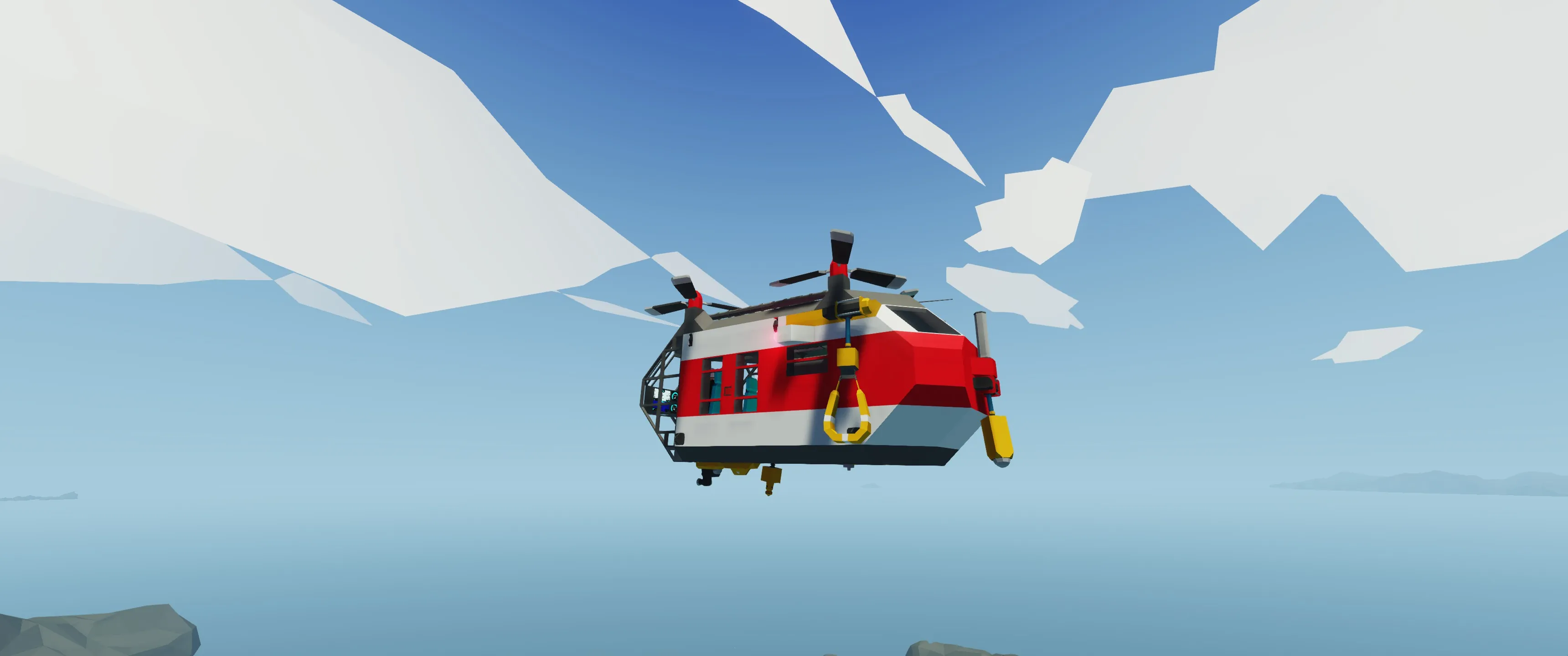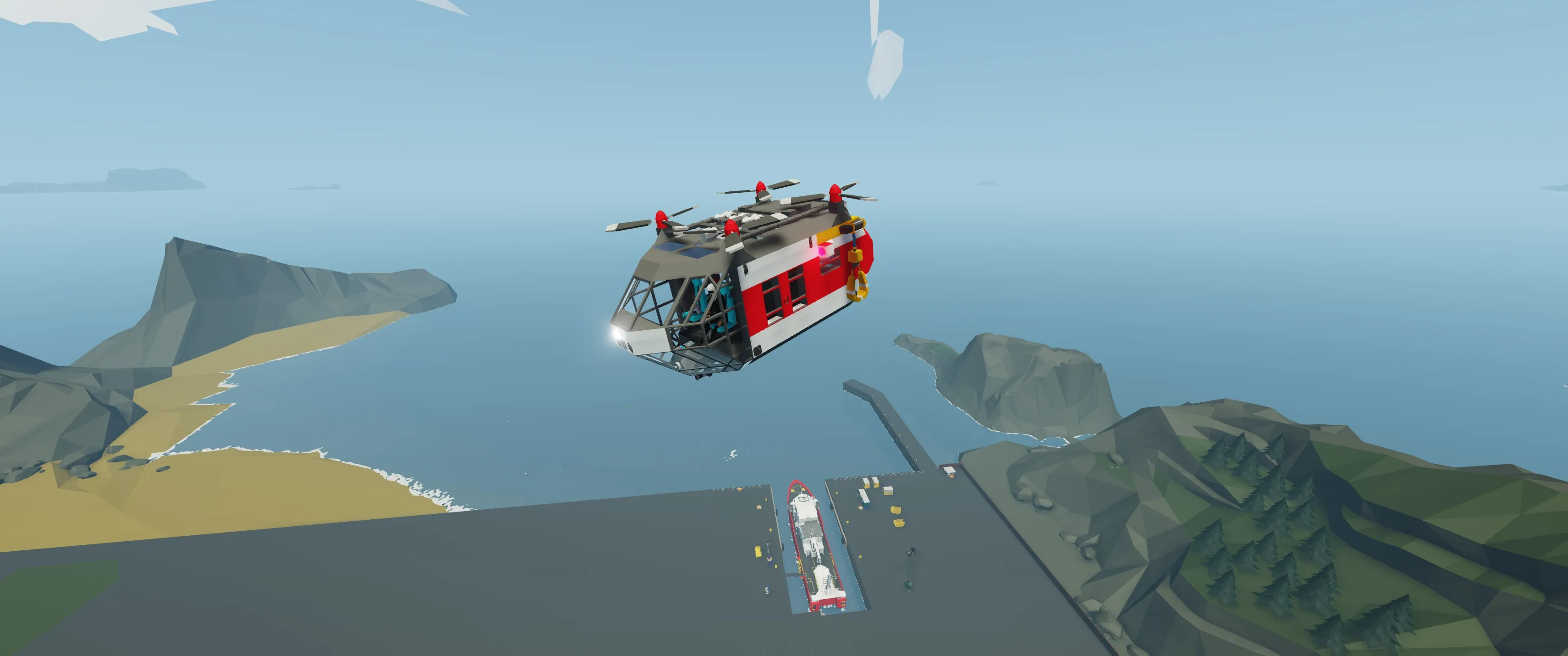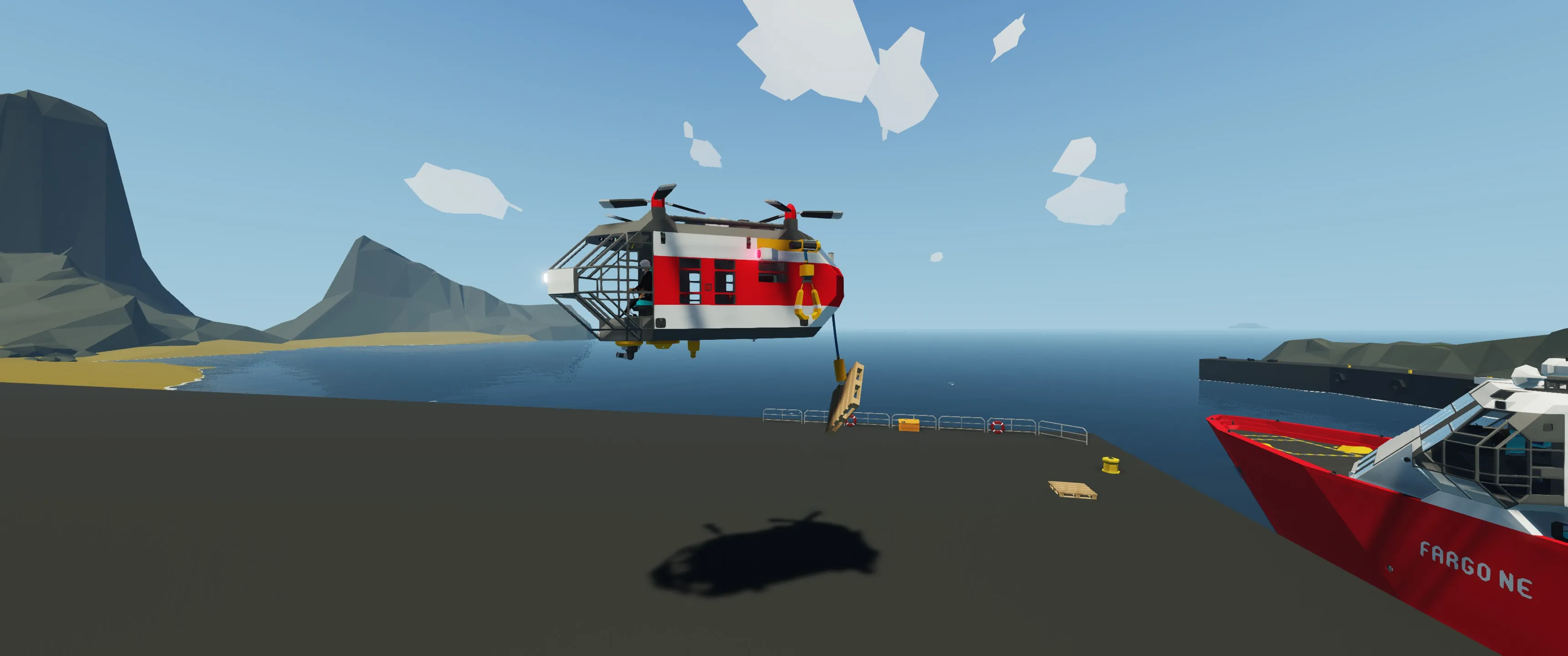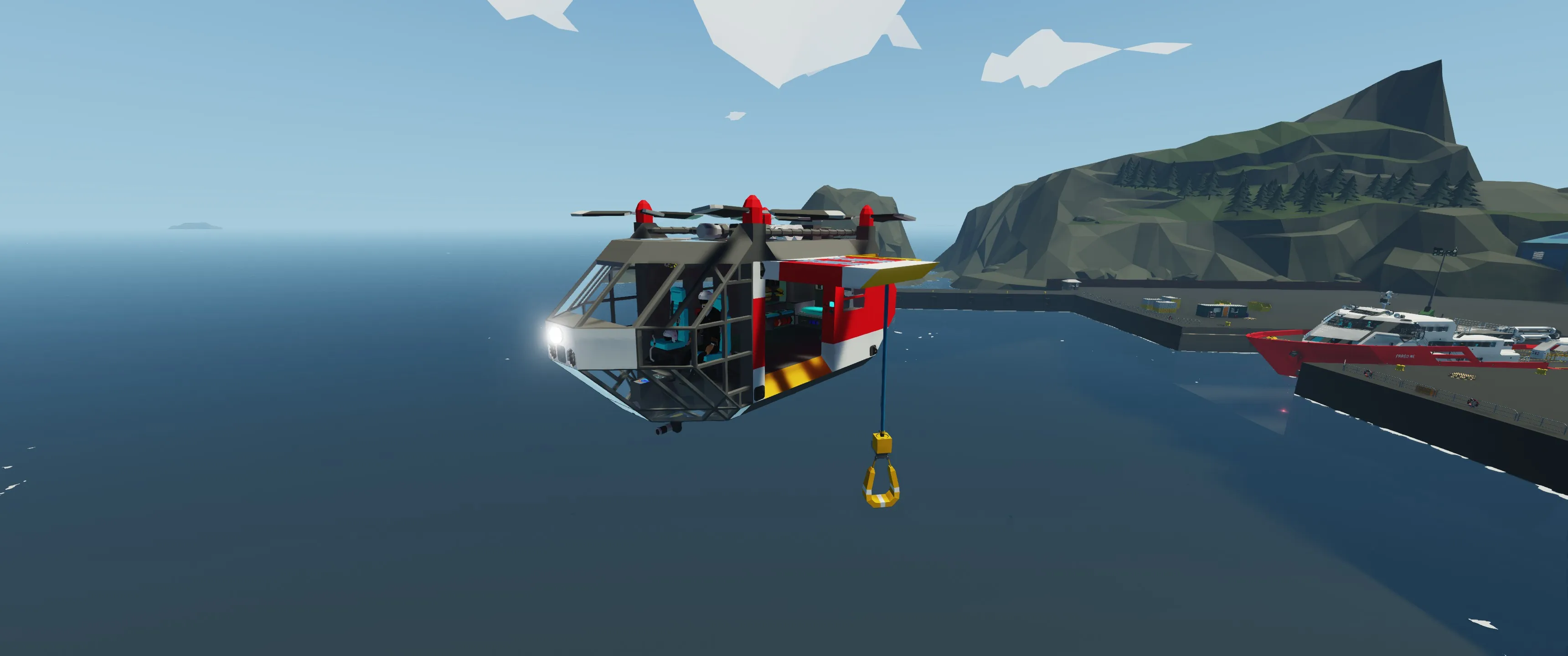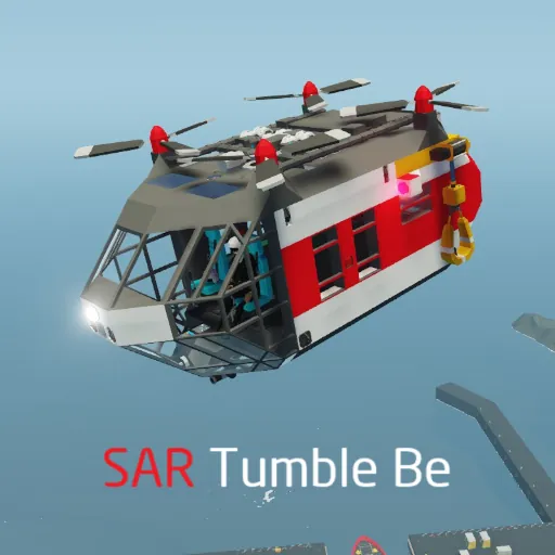 A fully electric helicopter for SAR operations. It comes with three winches, space for up to 9 people (11 if you leave them on the harness) and a water cannon fueled by a water source beneath. It is designed to work with the SAR Fargo Ne, it will transmit its position and a video feed to its mothership, while receiving the positon of the mothership itself. The batteries will recharge while docked to its mothership.