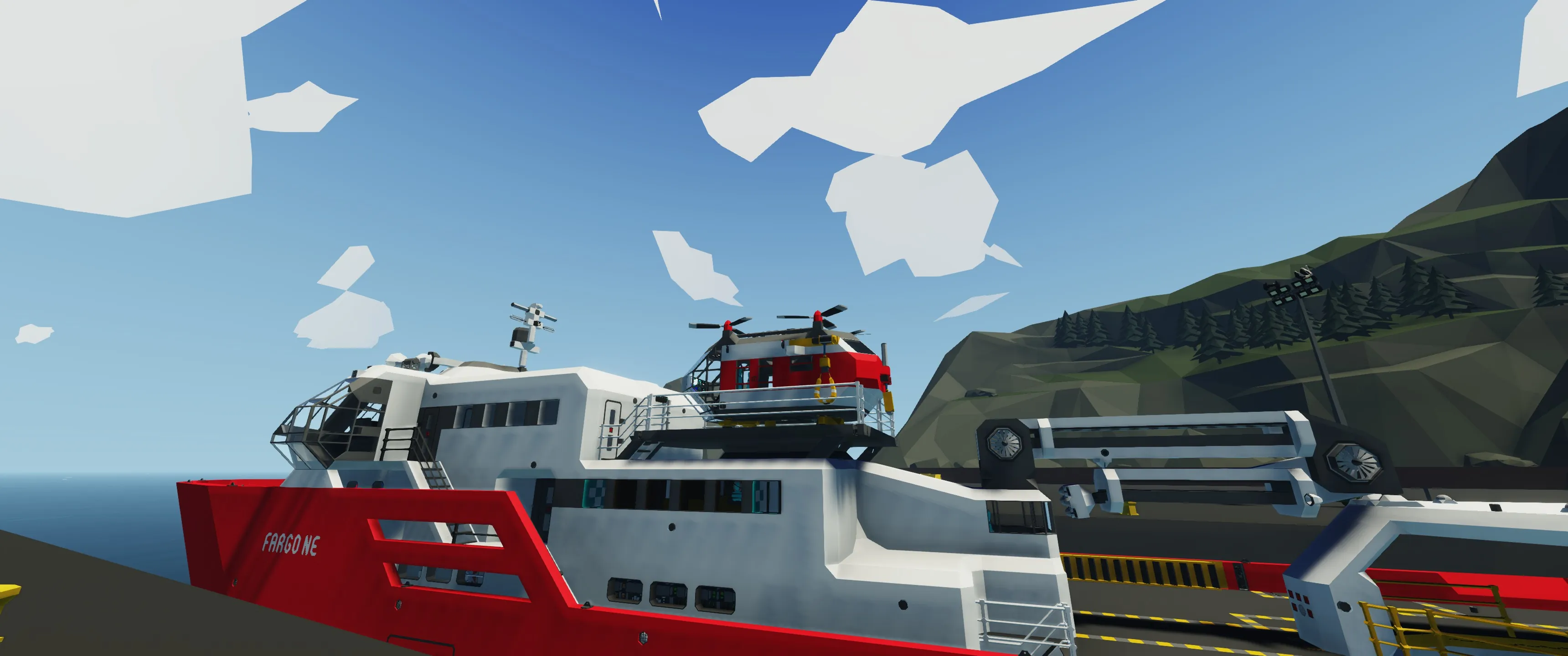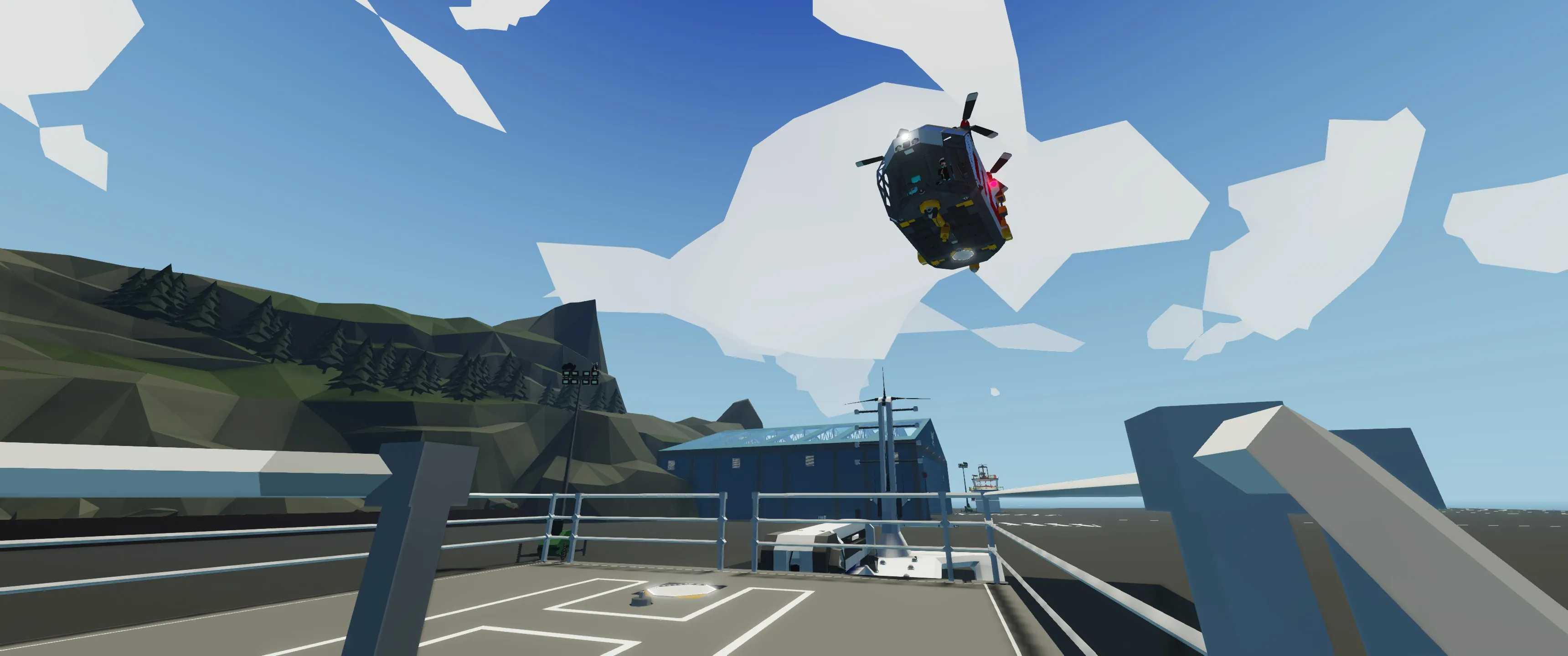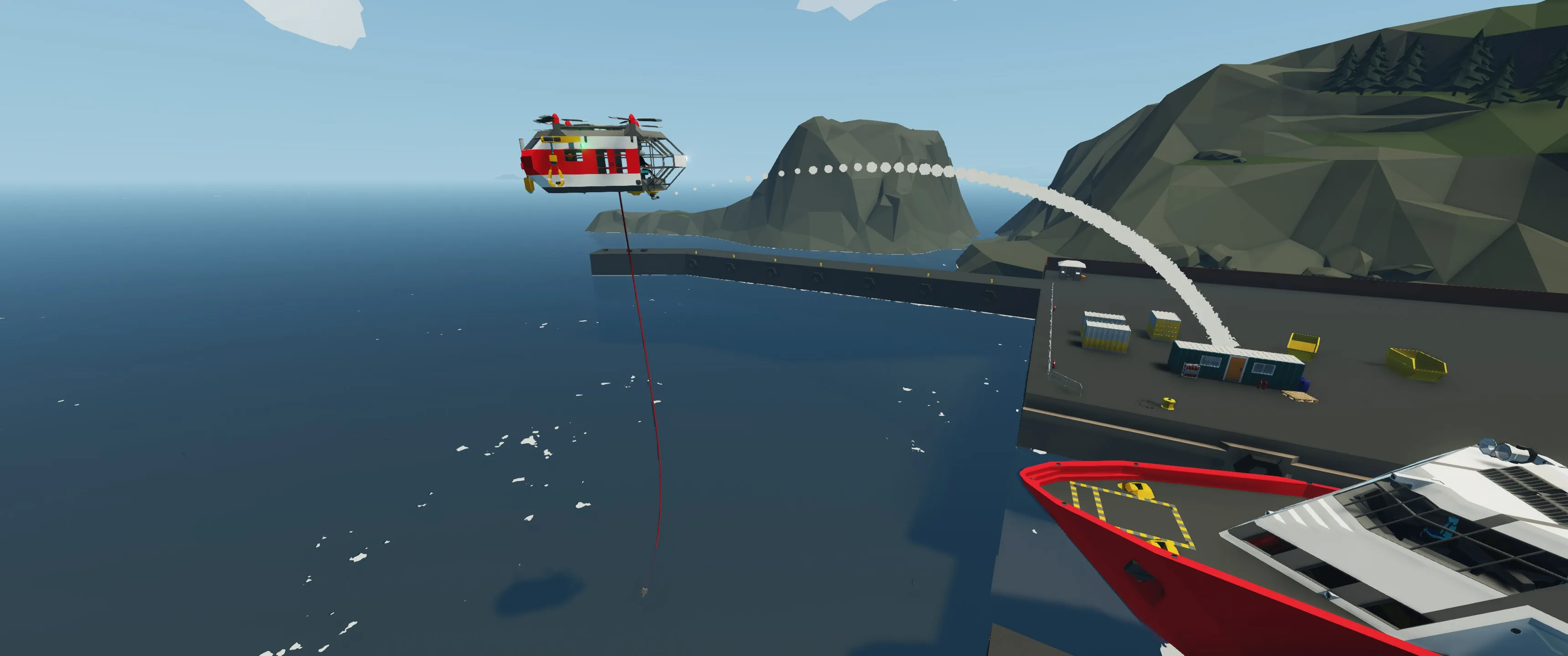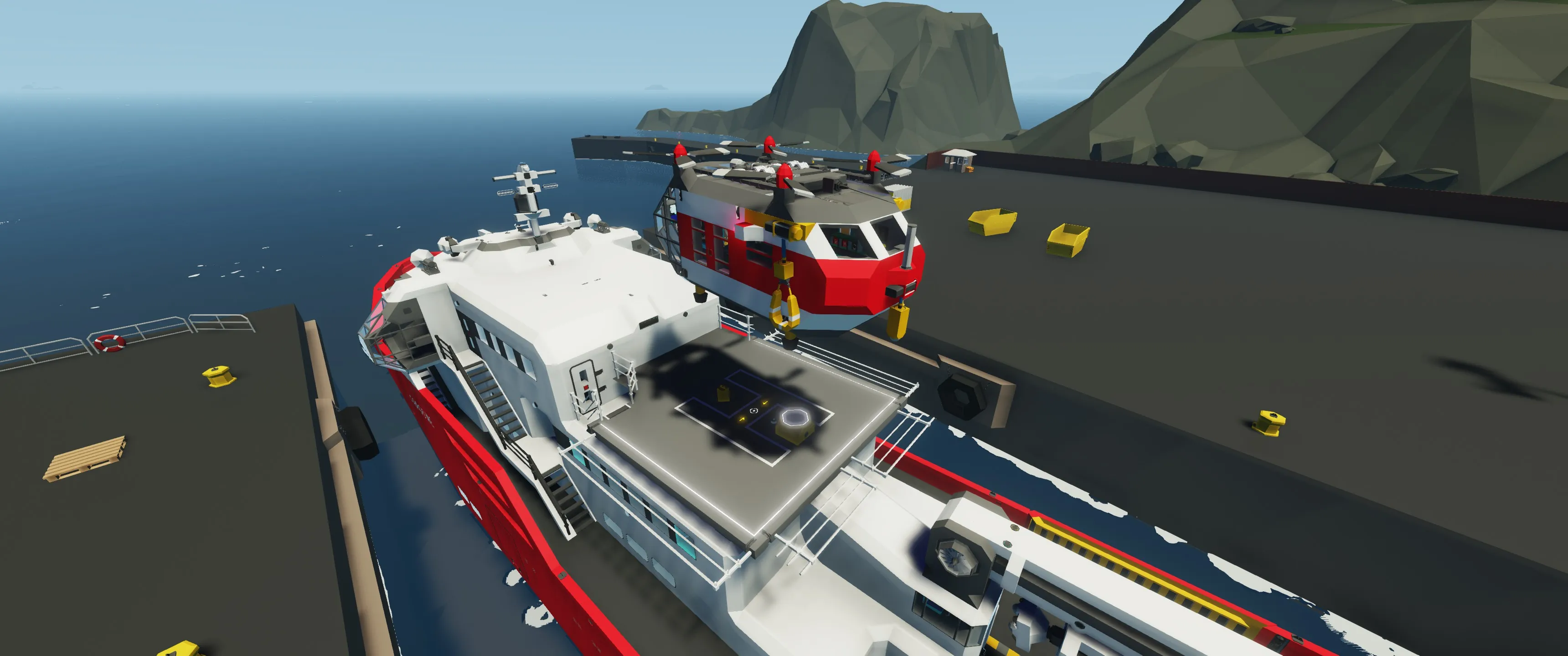 A fully electric helicopter for SAR operations. It comes with three winches, space for up to 9 people (11 if you leave them on the harness) and a water cannon fueled by a water source beneath. It is designed to work with the SAR Fargo Ne, it will transmit its position and a video feed to its mothership, while receiving the positon of the mothership itself. The batteries will recharge while docked to its mothership.