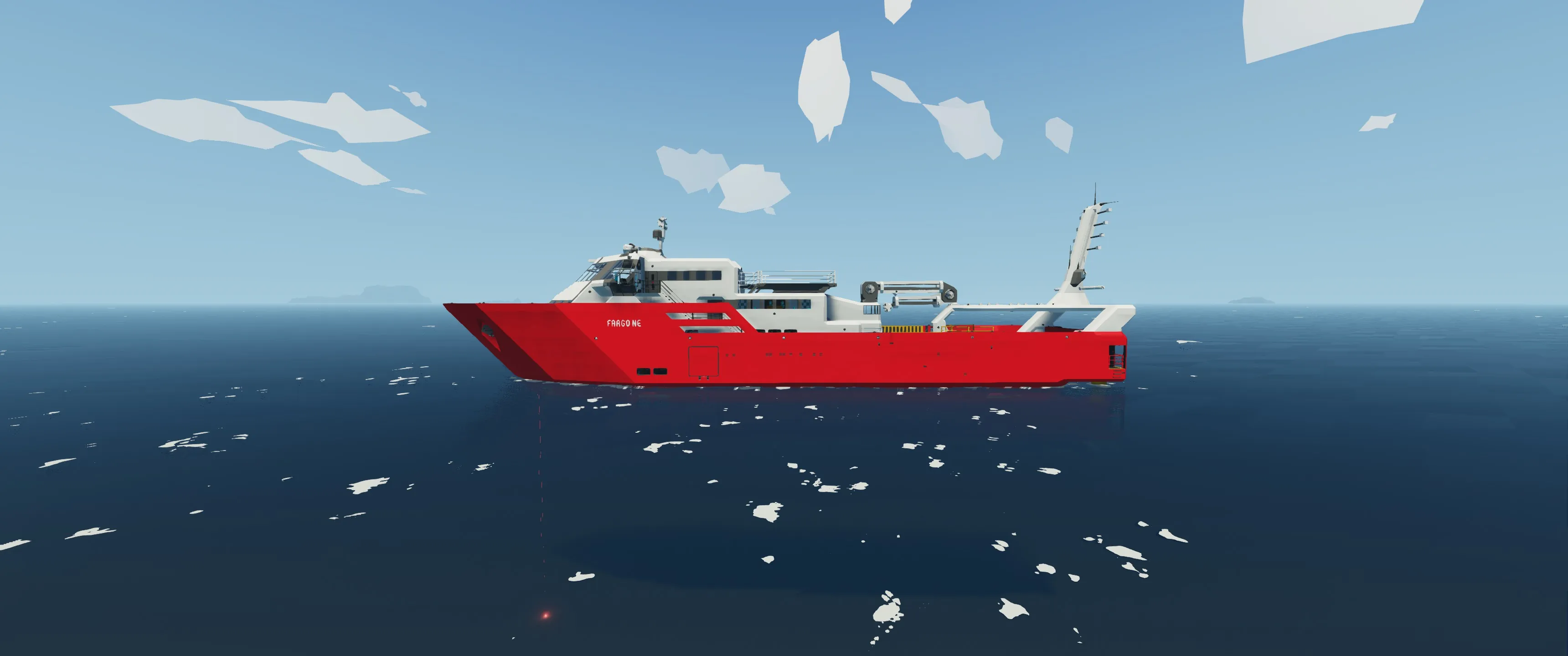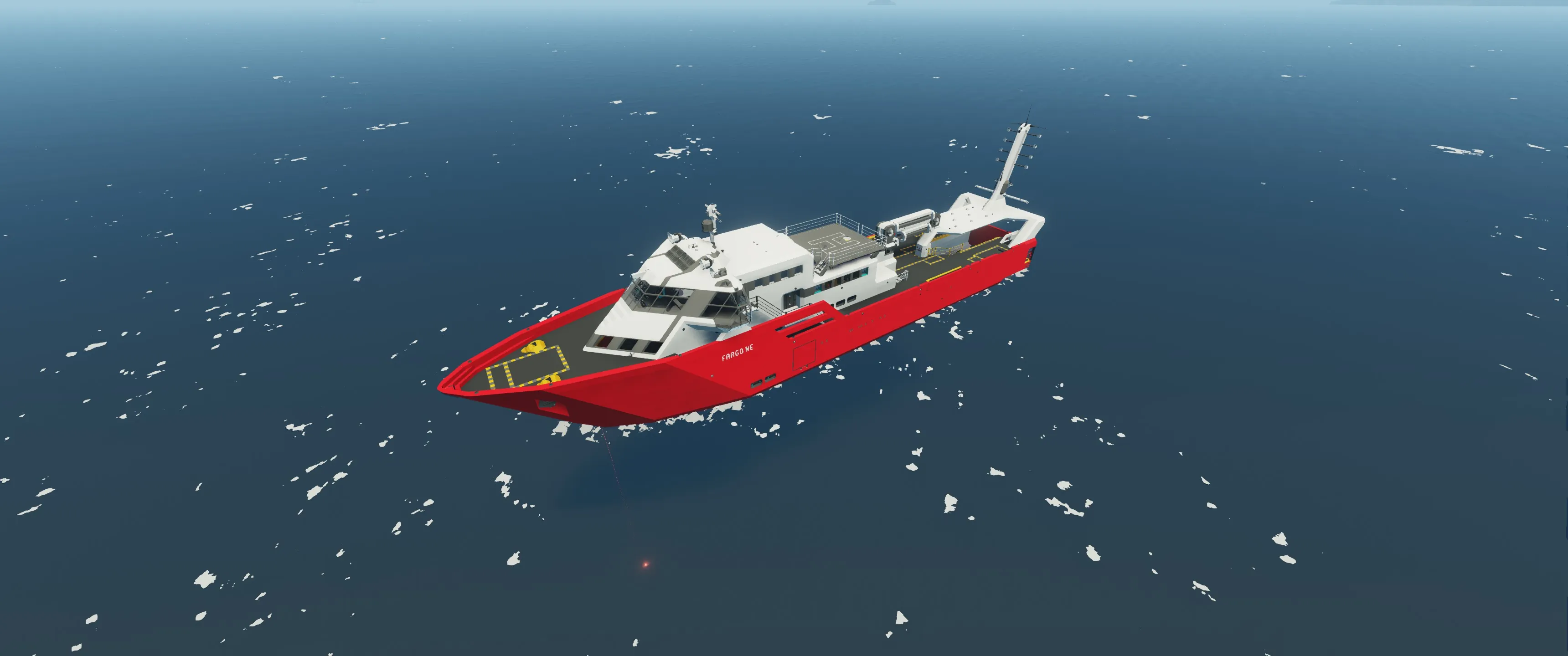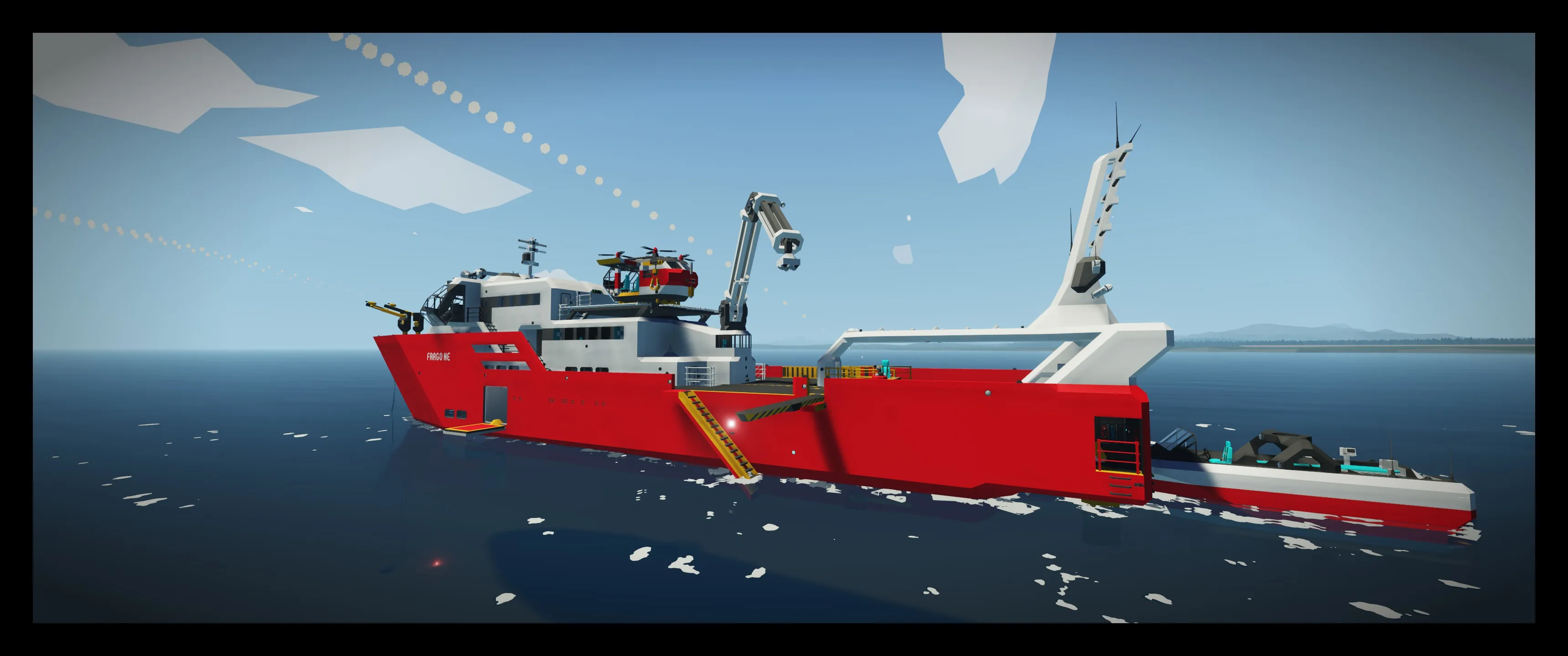 The Fargo Ne is a Search and Rescue ship with nuclear propulsion and a sleek and modern design. With highly automated systems she can be operated by a single person and is capable of reaching a topspeed of more than 90 knots in clear conditions.