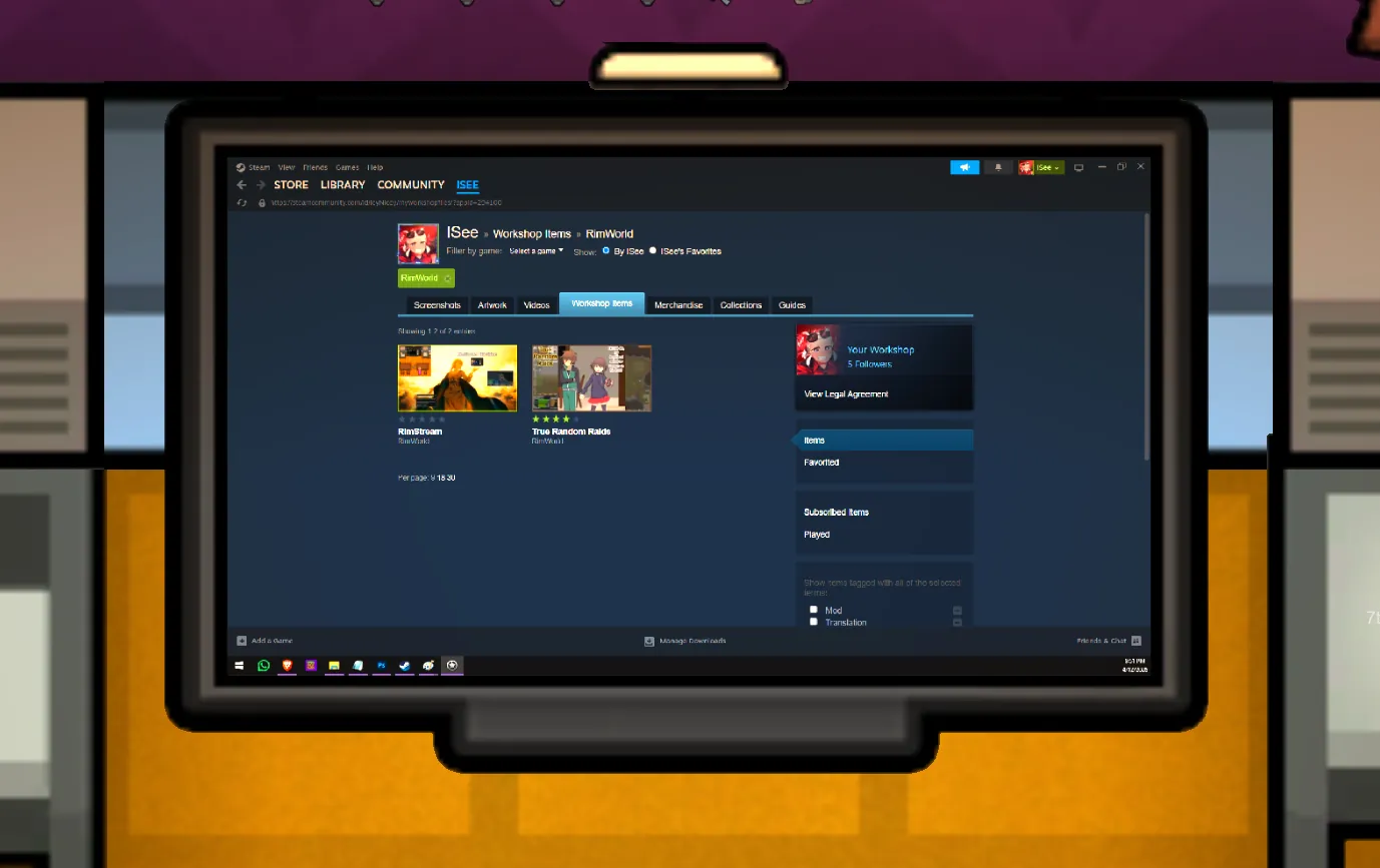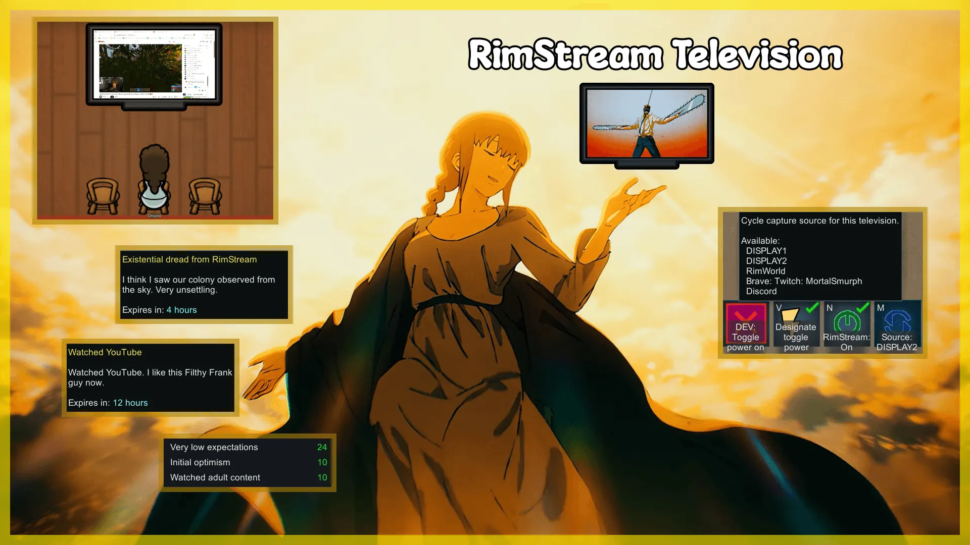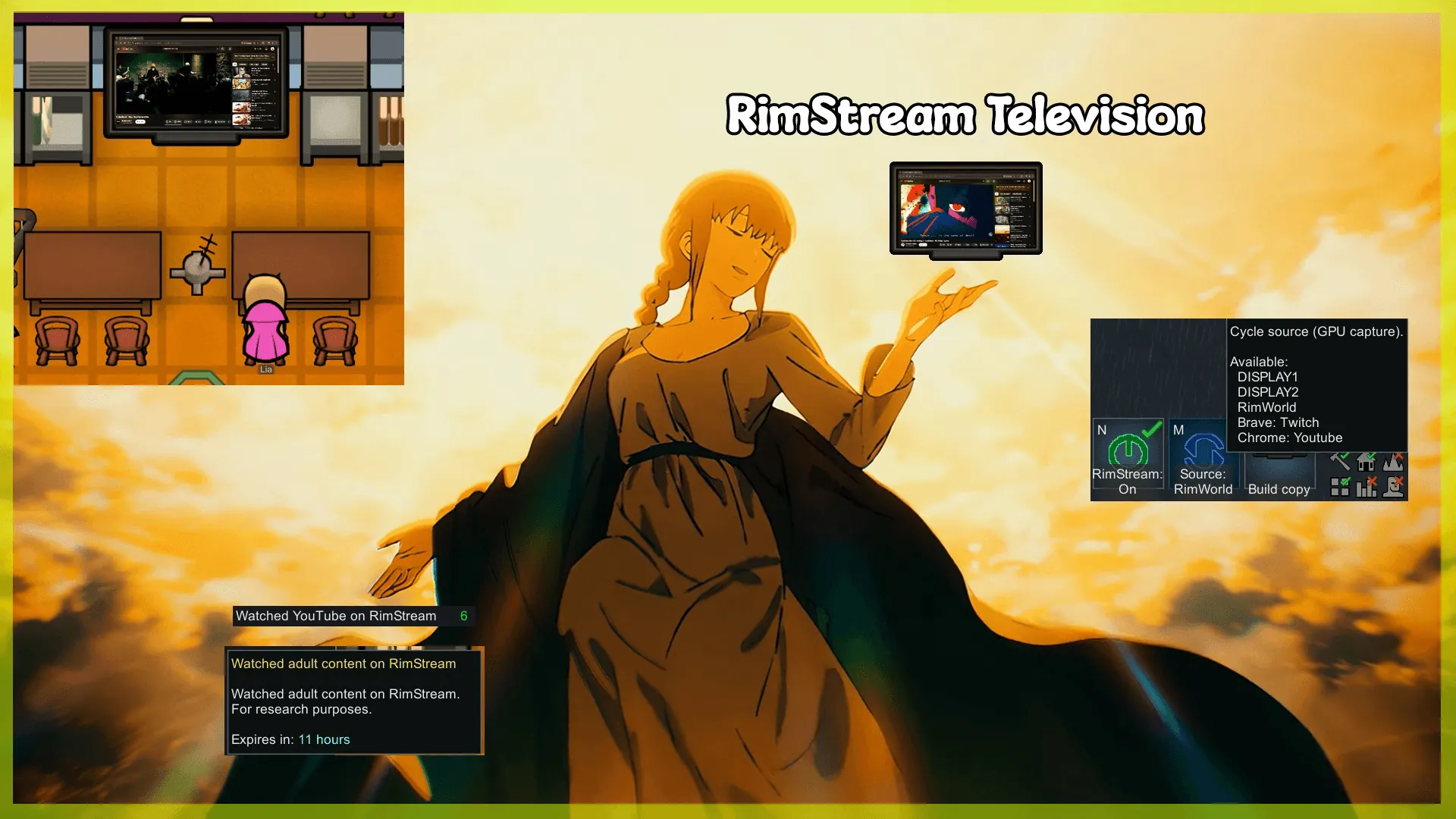 It lets you stream your Displays, Browsers, Discord, VLC Media Player, and Rimworld itself into a new recreational furniture item called RimStream Television.