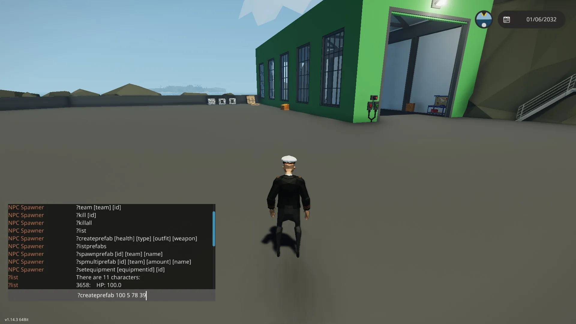 Create prefabs: ?createprefab [health] [type] [outfit] [weapon]