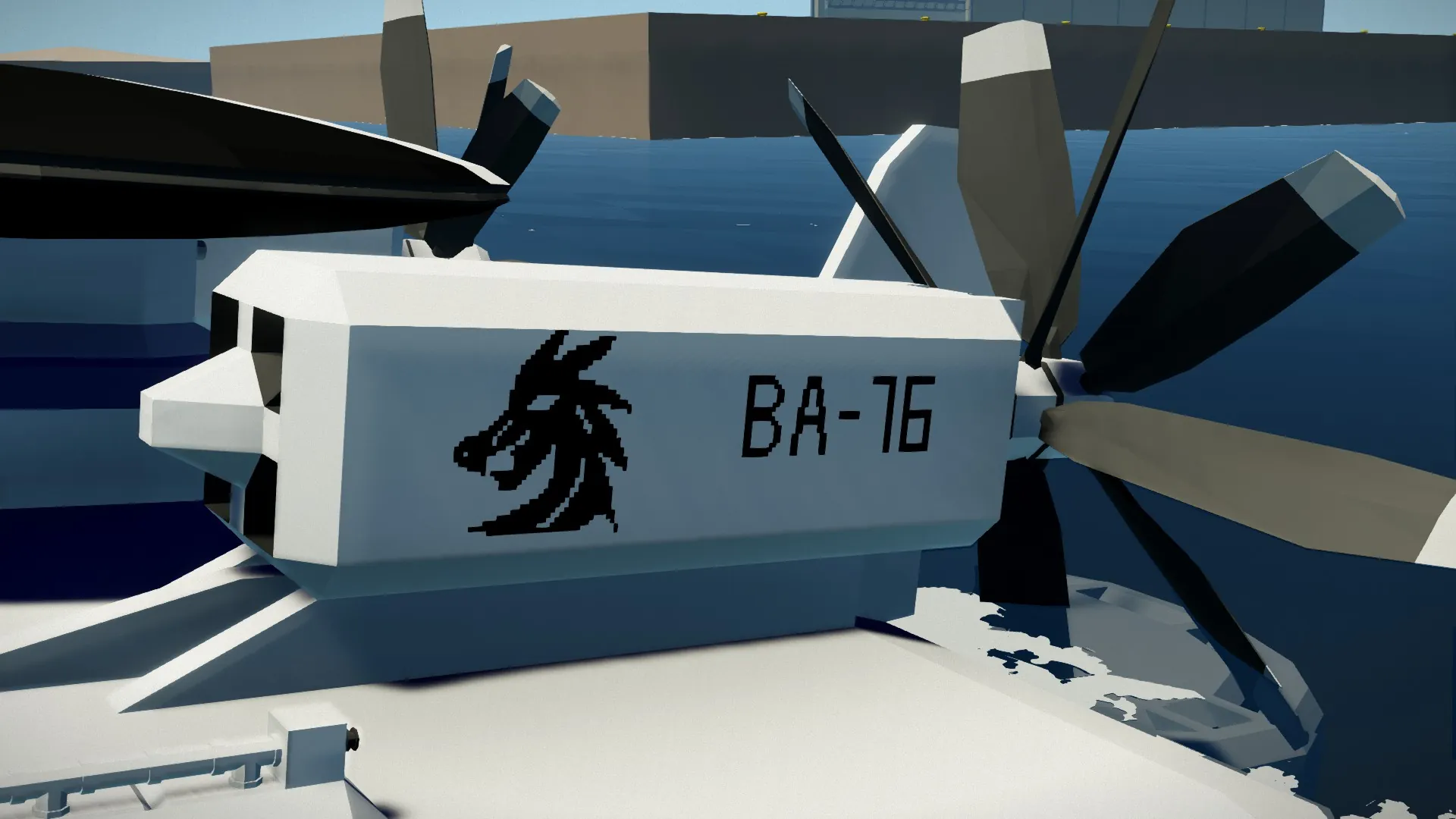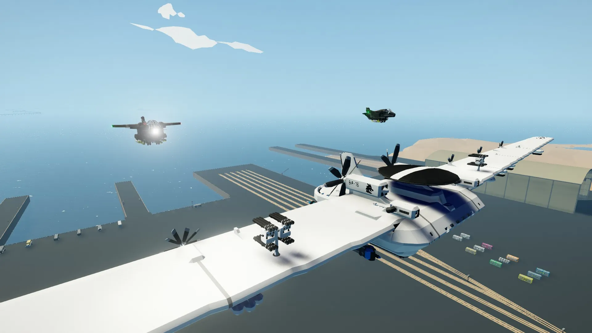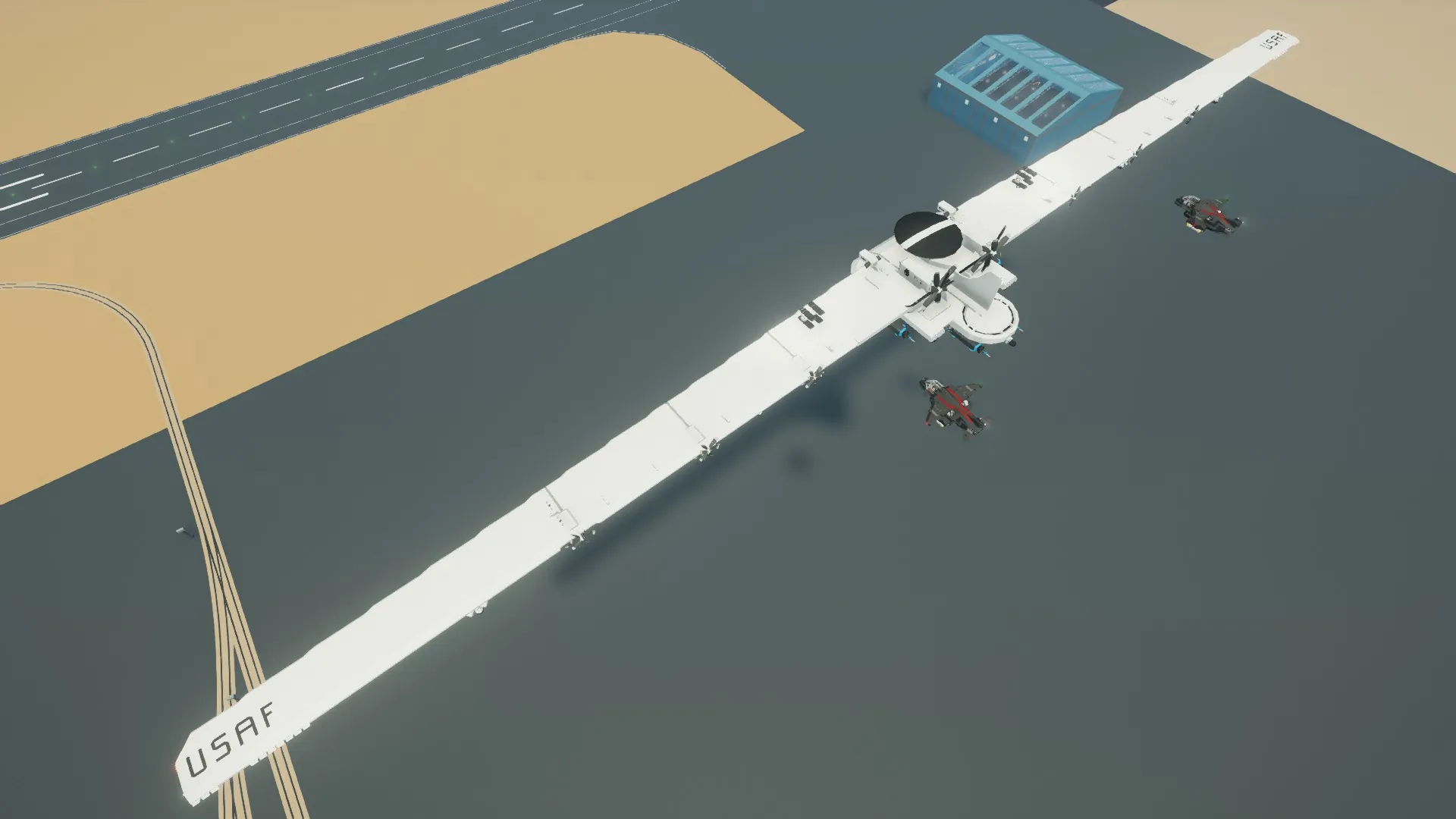 Turn on the power, and reactor. Then press the W key to move the plane clear of the harbor. Then unfold the wings. Do to physics being a bit weird. You may need to re spawn a few times.