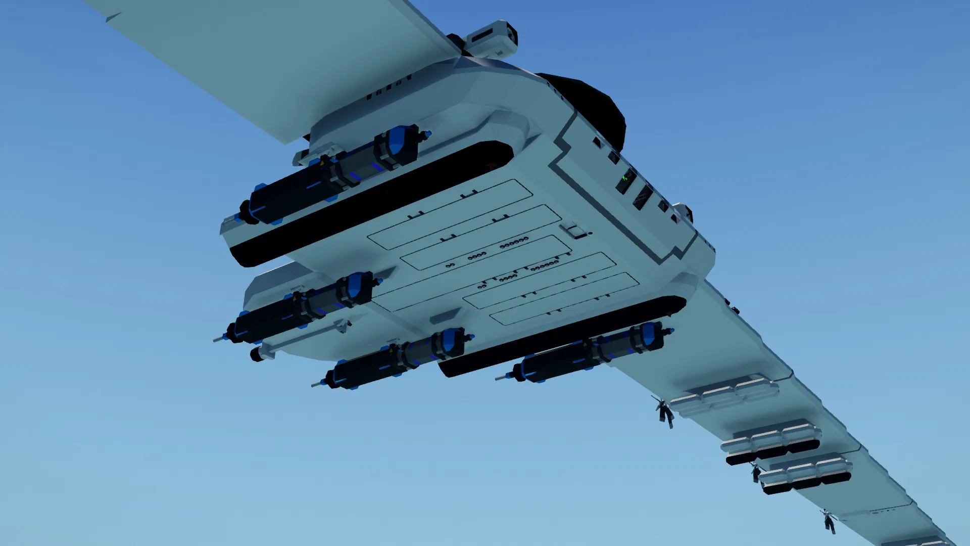 A very large heavy bomber, designed to take as much punishment as it can dish out. 48 point defense missiles, 4 EMP air defense missiles, and a blistering 32 warhead bomb bay between 8 delivery devices. On top of that. The plane has a auto repair system keeping major systems alive. Along with a early warning system and ultra high bombing set up. to keep the aircraft as safe as possible!