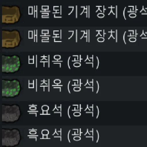검색(Z키) 시 '광석' 텍스트로 비취옥, 매몰된 기계 장치, 흑요석을 찾을 수 있습니다.