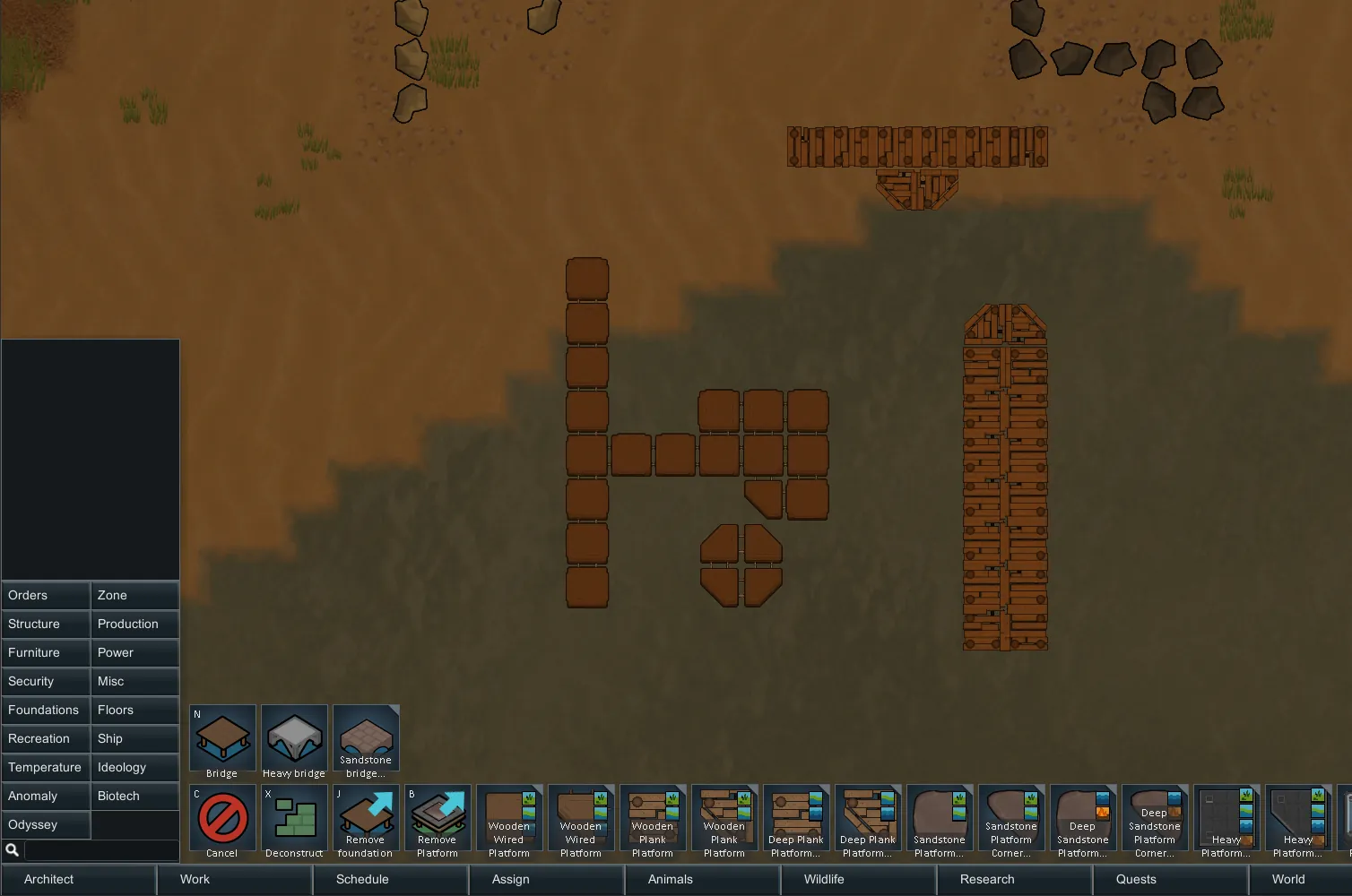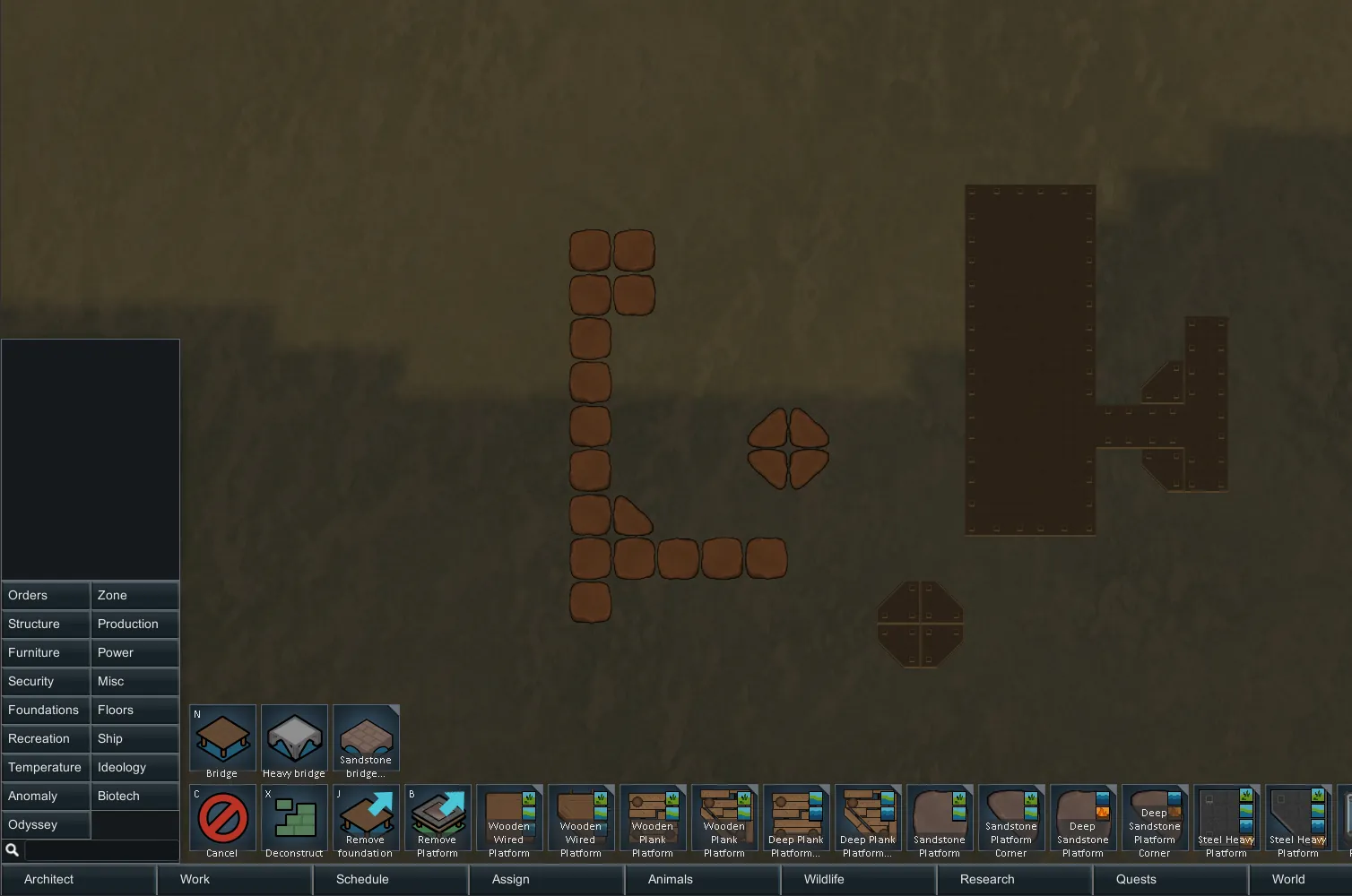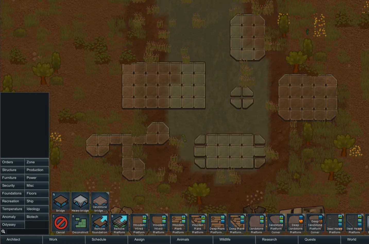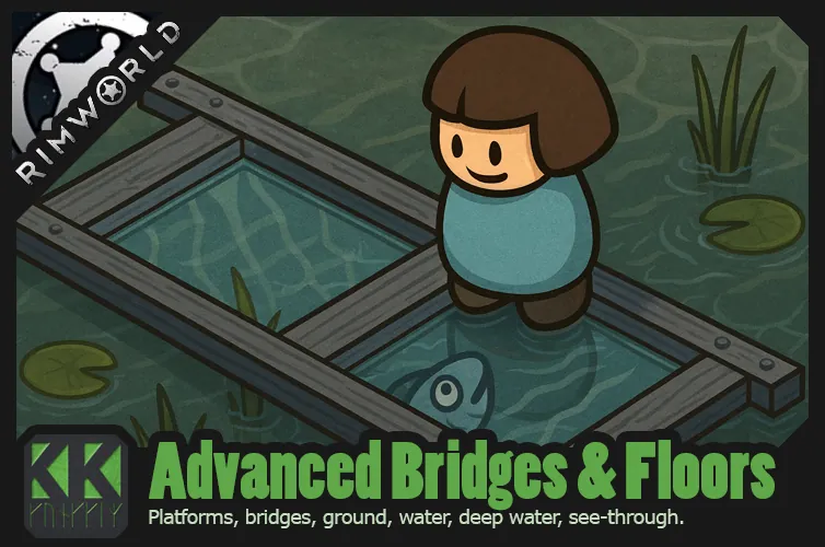Advanced Bridges & Floors is the pre-successor to [url=https://steamcommunity.com/sharedfiles/filedetails/?id=3006527110]Advanced Bridges & Corners[/url]. It lets you build platforms over land, mud, marsh, shallow and deep water. Platforms act as the top surface (don’t stack floors on them) and often let you see the ground or water beneath. It works much like the old mod, but instead of patching every terrain, each platform auto-places a custom invisible under-terrain—so you get clean, see-through platforms/bridges and automatic support for new DLC/mod terrains without making new patches.