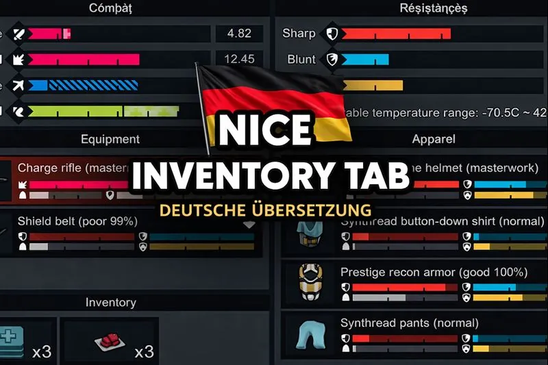 Diese Mod fügt eine vollständig deutsche Benutzeroberfläche für die beliebte RimWorld-Mod Nice Inventory Tab hinzu.