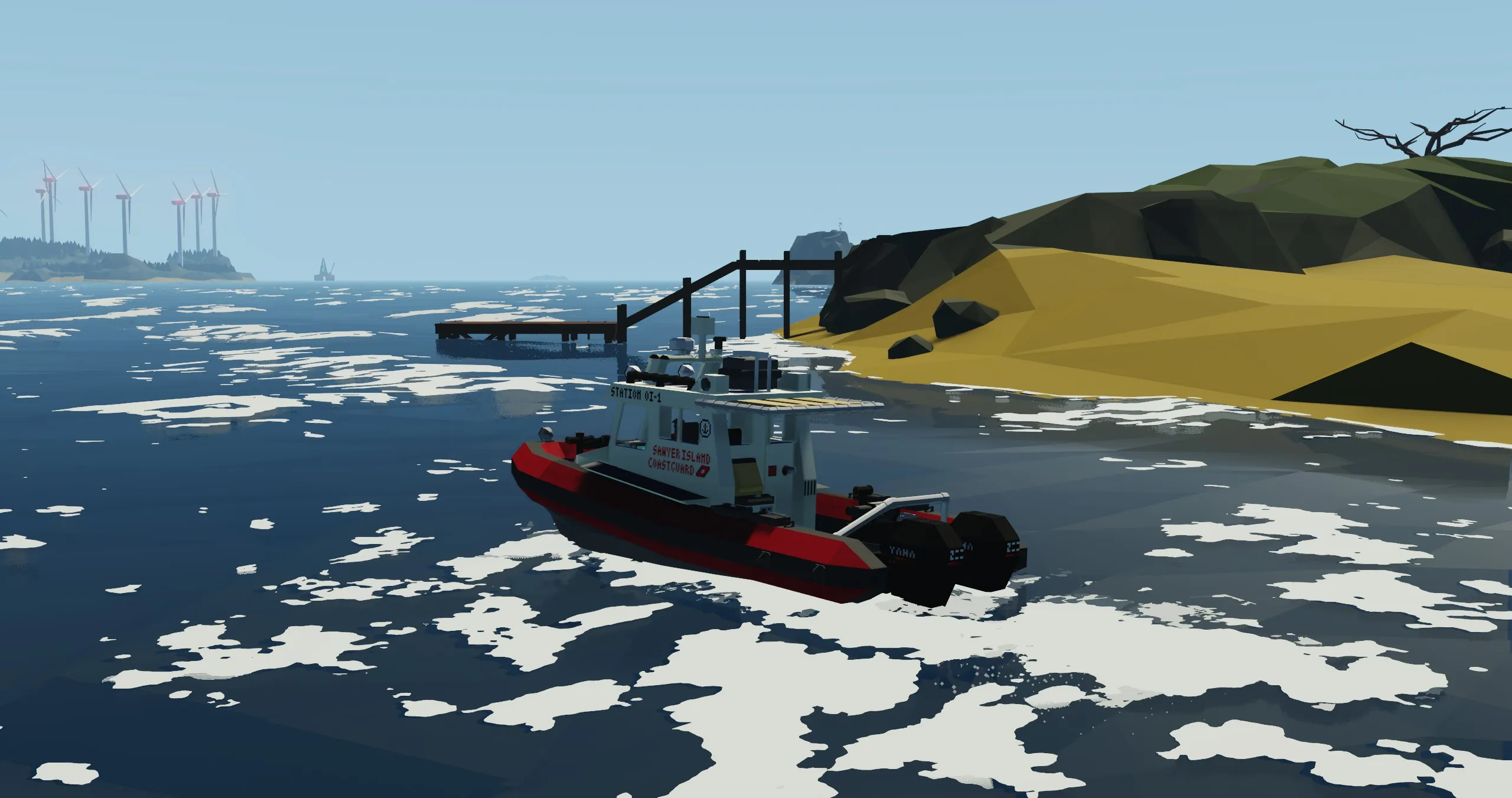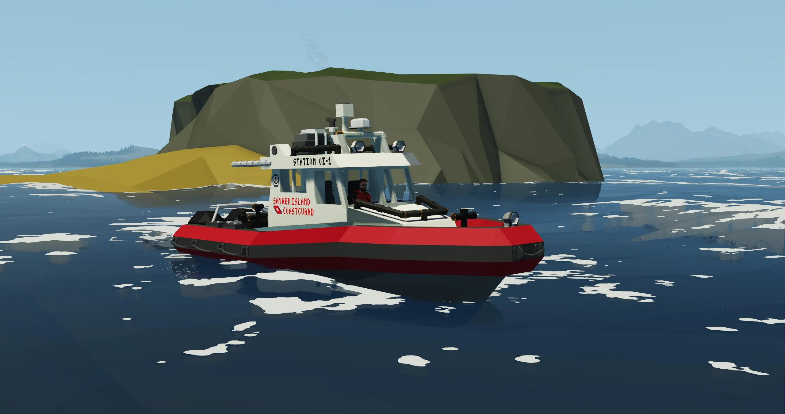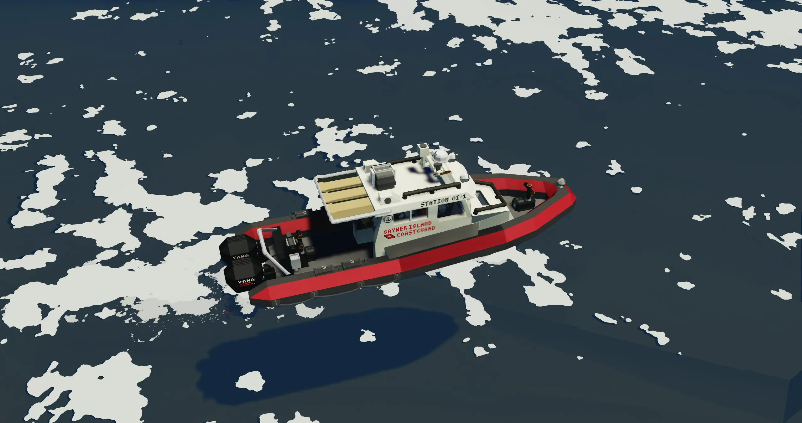 It is equipped with a touchscreen navigation system featuring a route planning autopilot, making longer journeys easy. The boat comes with all the necessary equipment to perform basic SAR and towing missions, which is stored in the small forward compartment of the main cabin. The Cabin has great forward and sideways visibility, great for first person gameplay. An efficient heater is also installed, so you can operate the boat in the arctic.