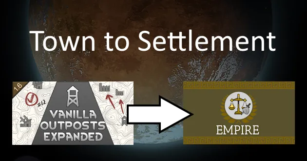 And if you add on my recent mod [b][url=https://steamcommunity.com/sharedfiles/filedetails/?id=3639689727]Vanilla Expanded Outposts: Settings for Towns[/url][/b], then you can also change VOE Towns to require nearby outposts. The overall progression then becomes: 1. found a few outposts 2. found a VOE town 3. finally, turn that town into an Empire settlement.