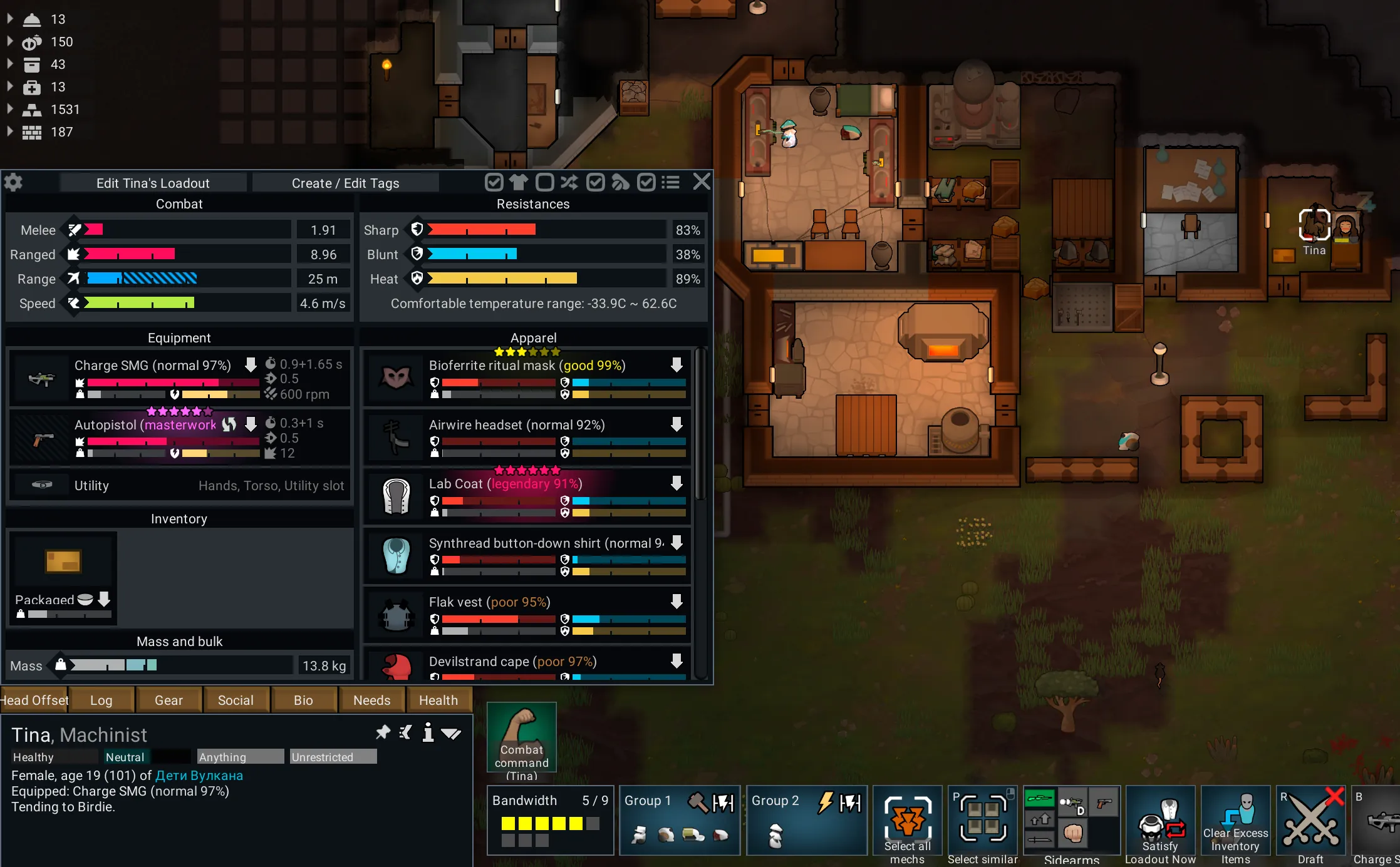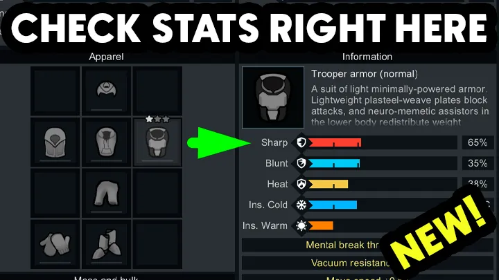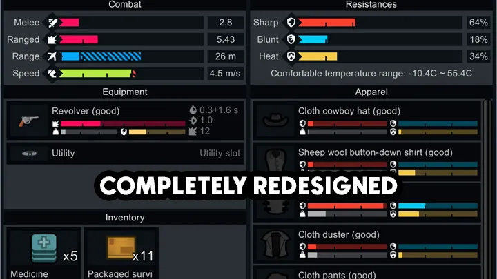 So, heres a complete redesign of the pawns equipment tab that puts all the key pawn info right in your face instantly. Probably covers everything that apparel or hediffs can affect.