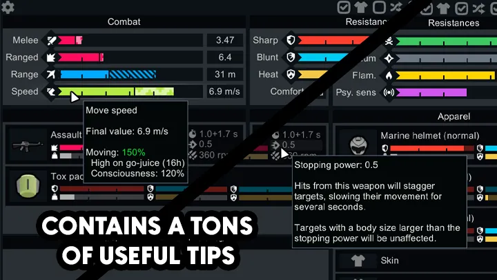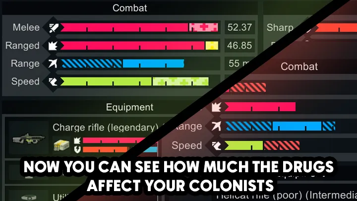 vanilla RimWorld interface is extremely inconvenient. You never get enough information at a glance, and that drives me nuts. To find what you need, you have to dig through dozens of menus and tabs, hunting for the right stats. It turns into absolute madness once you start piling on a bunch of mods.