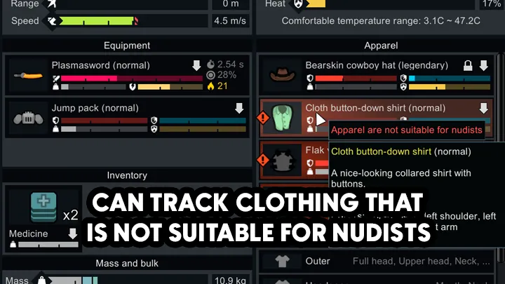 Moreover, you will be notified if the clothing is not suitable for a pawn for some reason (for example, clothing for a nudist), the same applies to clothing from corpses, ranged weapons with energy shields, etc.