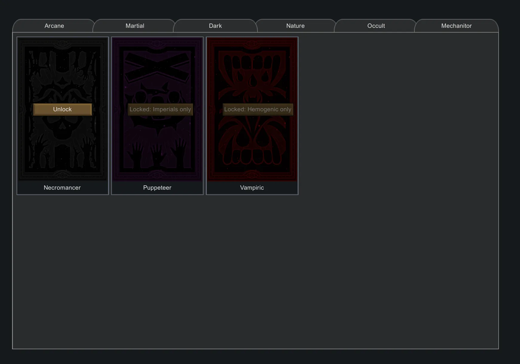 [b]Dark[/b] holds psycasts of a more sinister nature, including Hemosage, Puppeteer, and Necropath (if all trees are loaded).