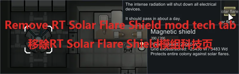 把“RT Solar Flare Shield”模组的科技页删除,只用一个科研选项的科技页真是让人难受。 Remove the technology tab for the "RT Solar Flare Shield" mod, because it's so frustrating to have a tech page with only one research option.