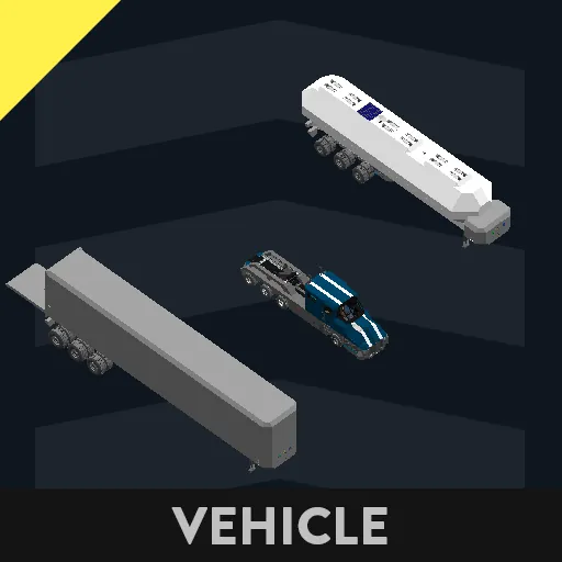 The Dryvan trailer is a more heavily modified version of the standard Dryvan trailer, the swinging doors have been replaced with a single ramp, and the interior height has been increased. The length has also been increased, now much longer than standard. It has also inherited the tri-axle set-up and buffed suspension. Though it may not look it from the thumbnail, the semi truck can actually fit inside the trailer (at least width wise), so it should have plenty of space for a couple of cars and trucks.