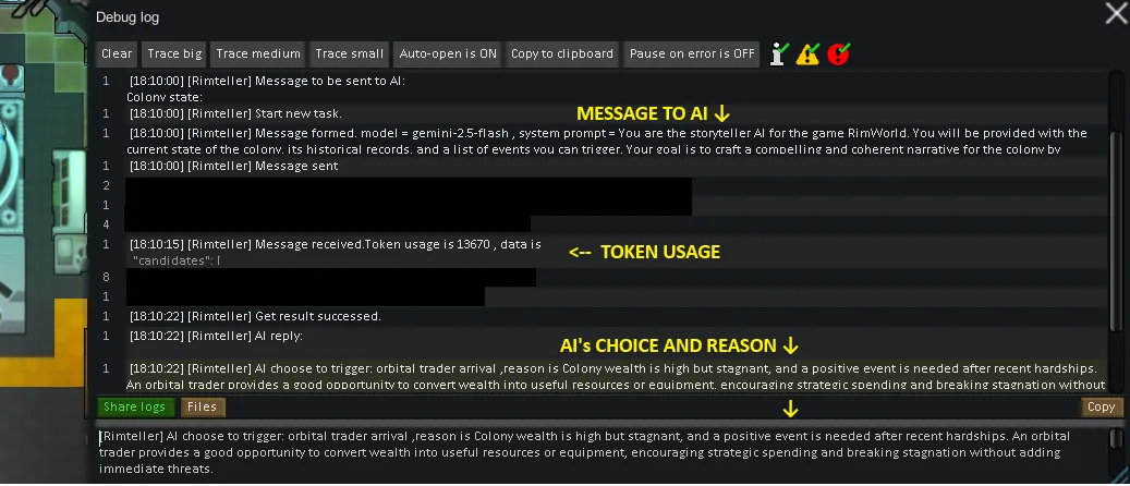 Press “~” to open the log, find the white message starting with “[Rimteller] AI choose to trigger:”, and read the AI’s reasoning.