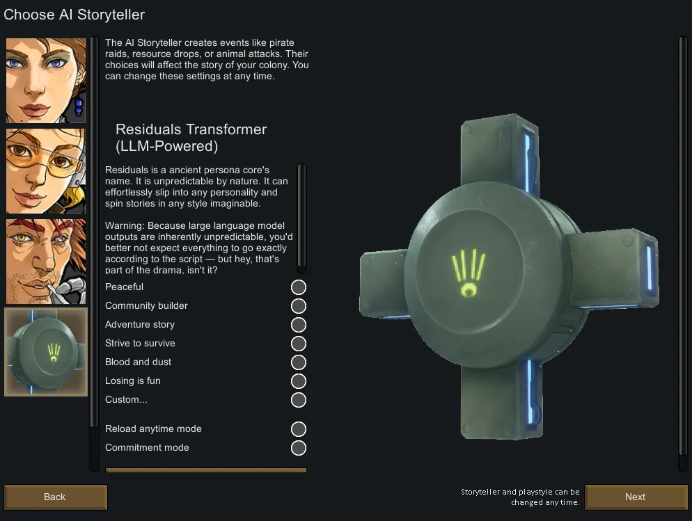 This mod adds an AI-driven (large language model) storyteller called “Residuals.” It purposefully generates events based on the current state of the colony, its development trends, and historical records, driving the colony’s narrative forward according to a chosen style.