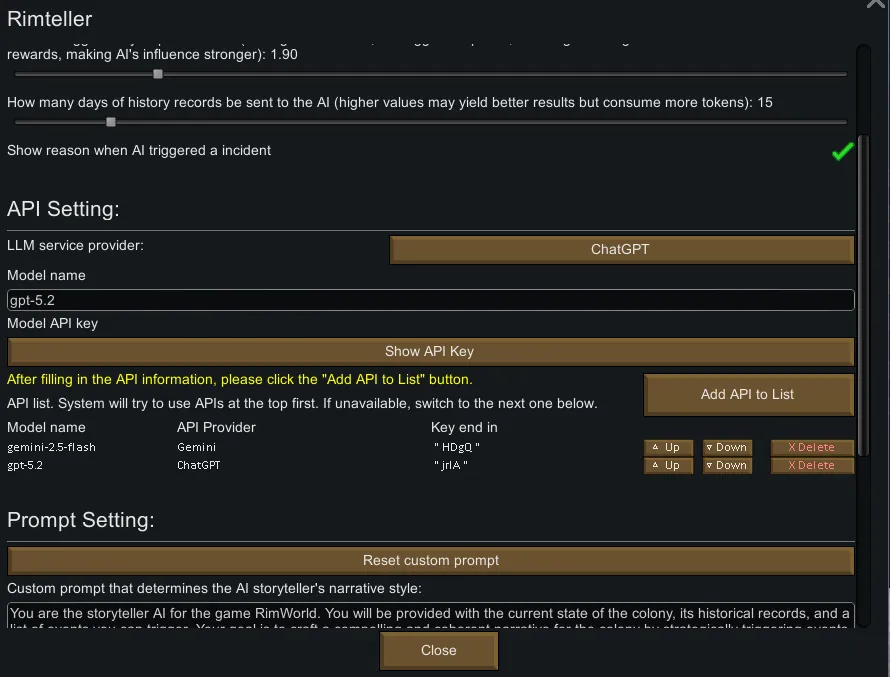 Fully customizable — you can modify the prompt in the mod settings to adjust the storyteller’s style. From a cozy, idyllic pastoral life to a blood-soaked battlefield of steel and fire, it’s entirely up to you.