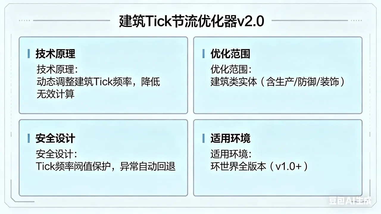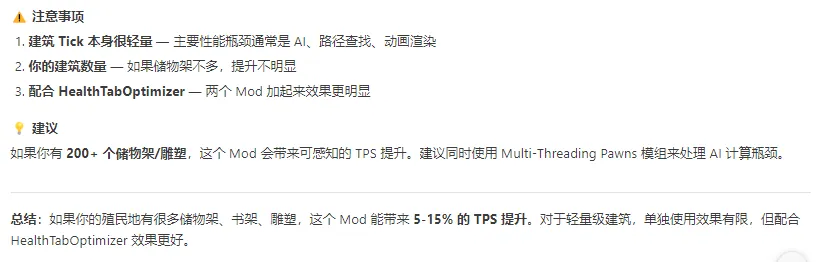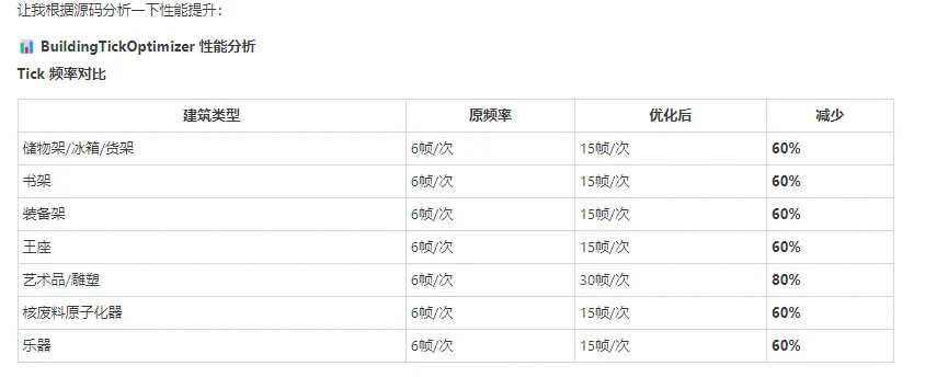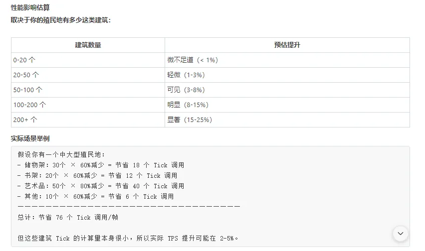 建筑Tick节流优化器 v2.0 - 减少低频变化建筑的Tick频率,提升大规模mod环境下的游戏性能。