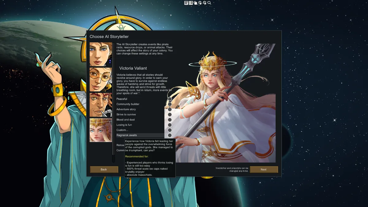 Adds Victoria Valiant, Her Eternal Majesty, Everqueen of the Imperium, God-Empress of Alance, God-Slayer, Defender of Elvenkind, Shield of Atlas, Conqueror of the Stars and Guardian of the Cosmic Order, as your storyteller. She behaves sort of like Randy, but she generates more raids and with shorter cooldowns for you to recover. However, on the other hand, she also generates more events to make up this in raid difficulty.