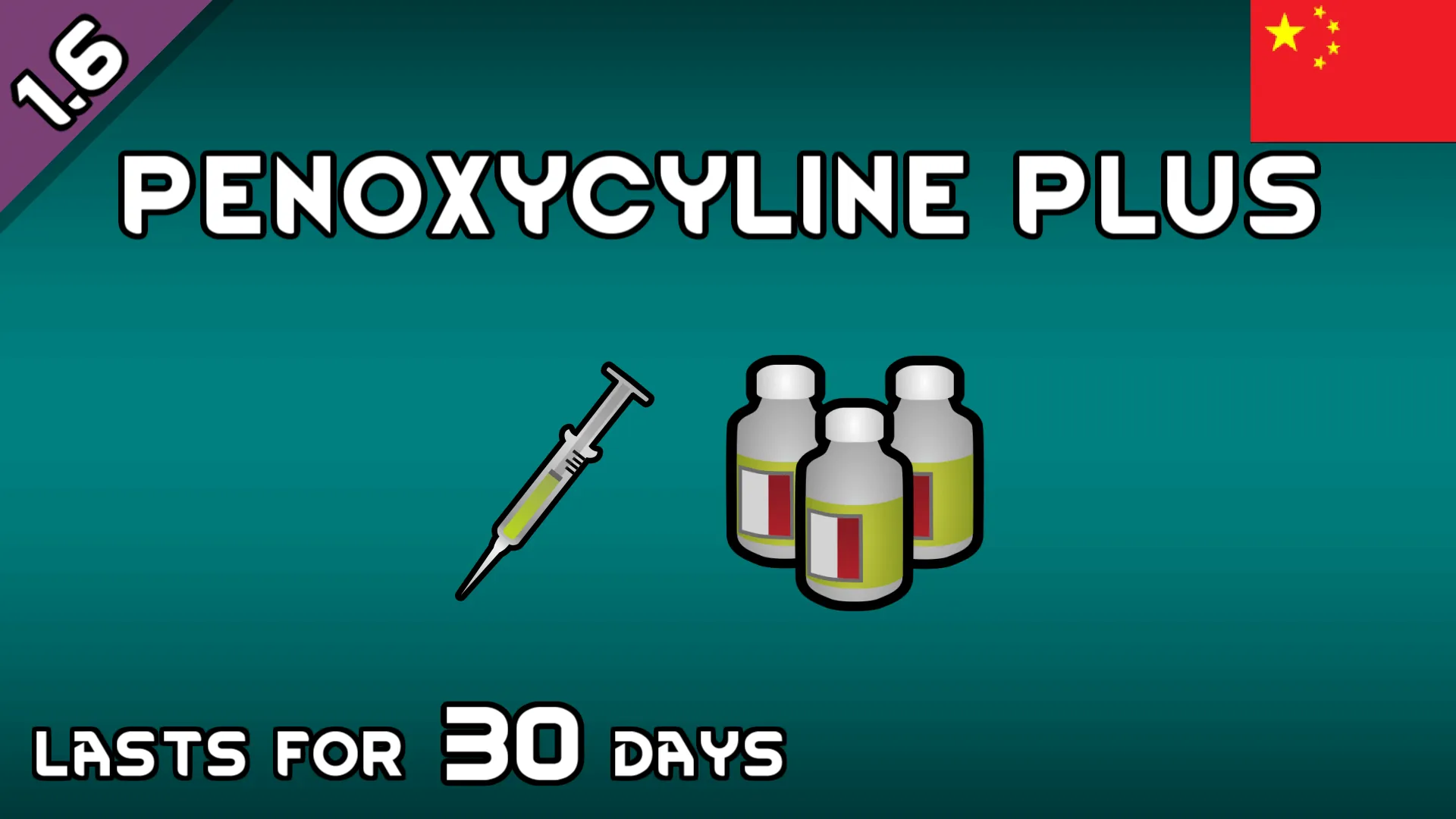 长效佩诺西林针剂 效果持续约30天,但药物政策中可设定的最长期限为 “25天”。请注意此限制源于《环世界》原版机制。