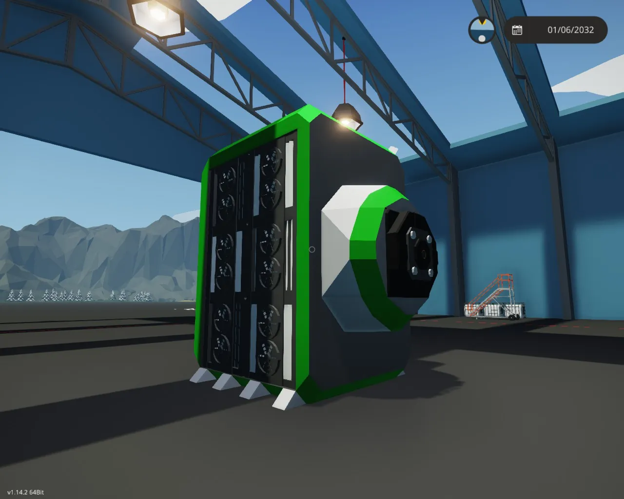 A compact large modular engine that's designed to be easily placed into any ship without having to put too much effort into it. Dimensions: Length - 4.5m Width - 2.75m Height - 4m