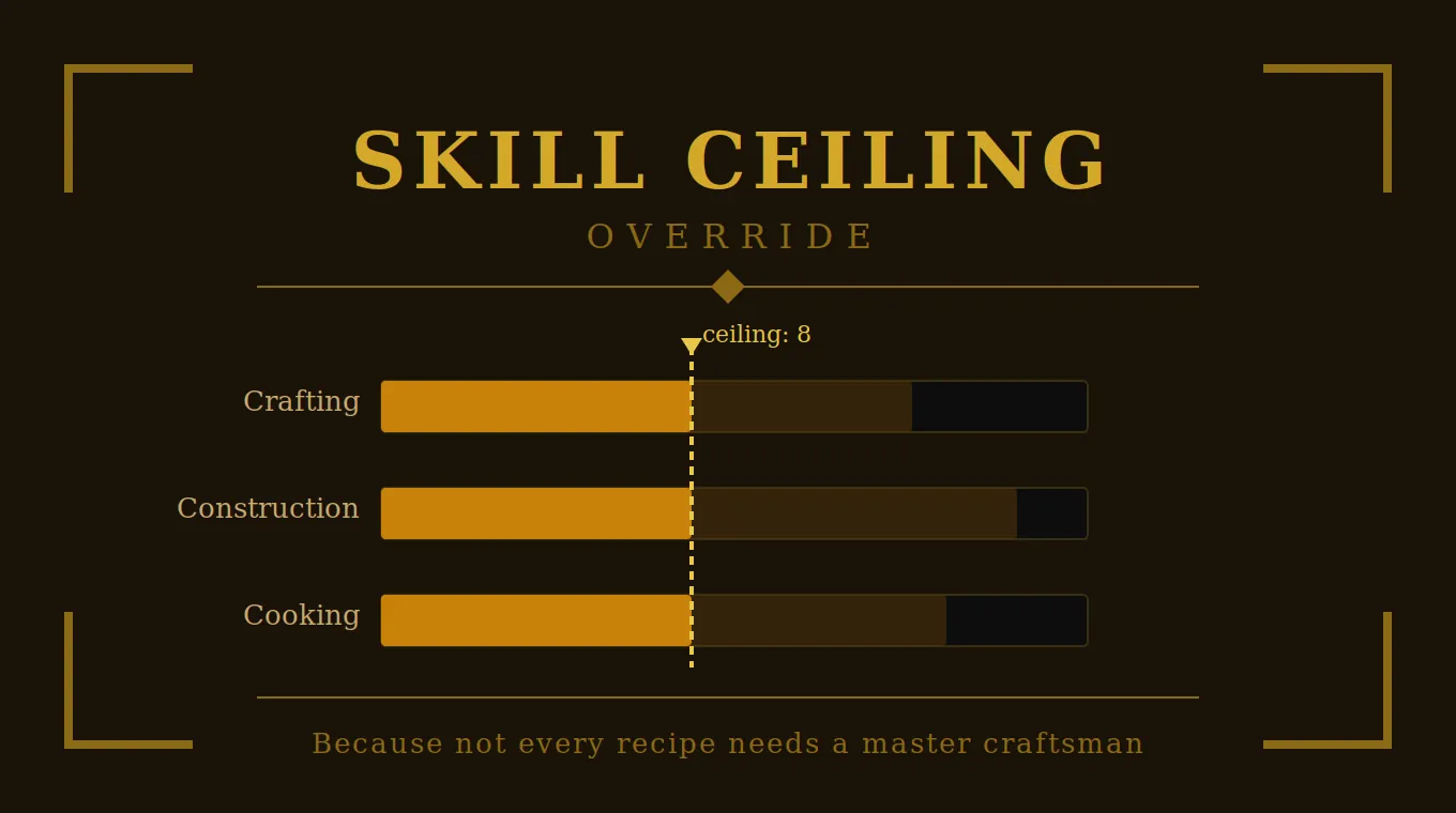 Skill Ceiling Override lets you set a global cap on all skill requirements across the game, vanilla and modded alike. If a mod demands level 15 to craft something and your cap is 8, the new requirement becomes 8. Lower requirements stay untouched.