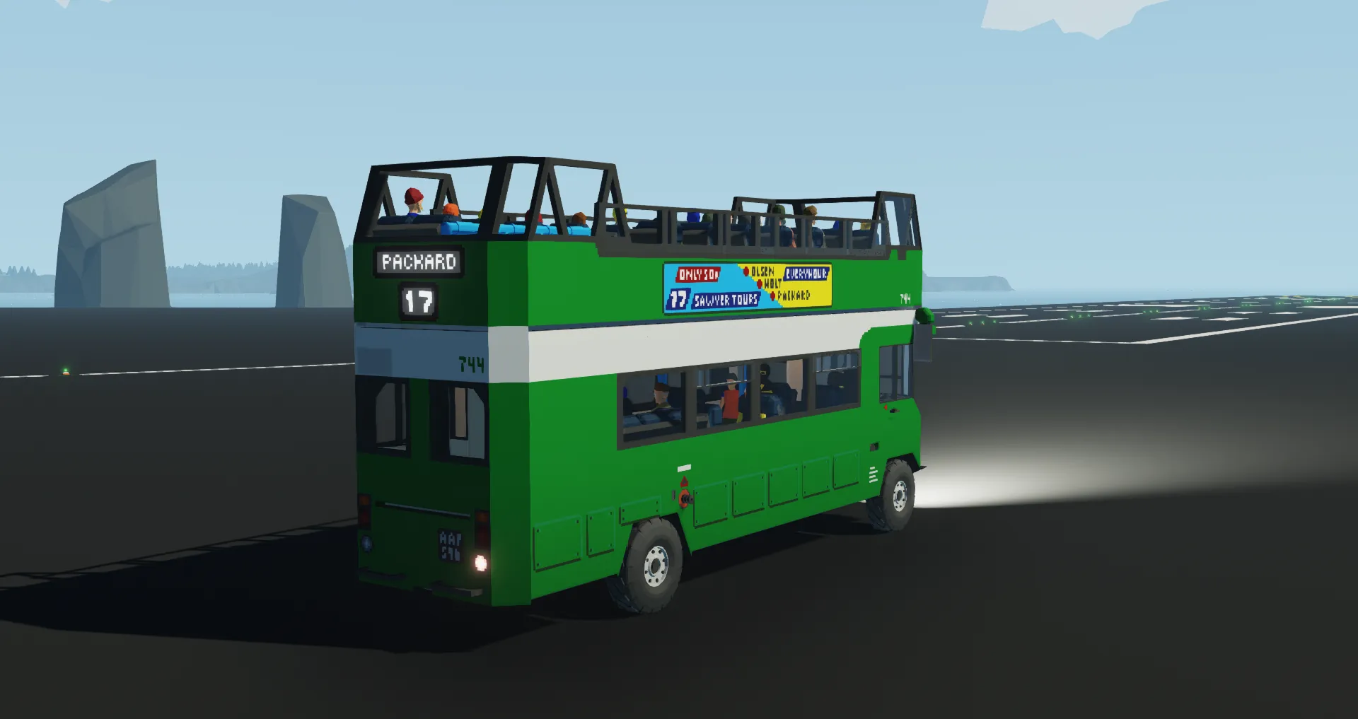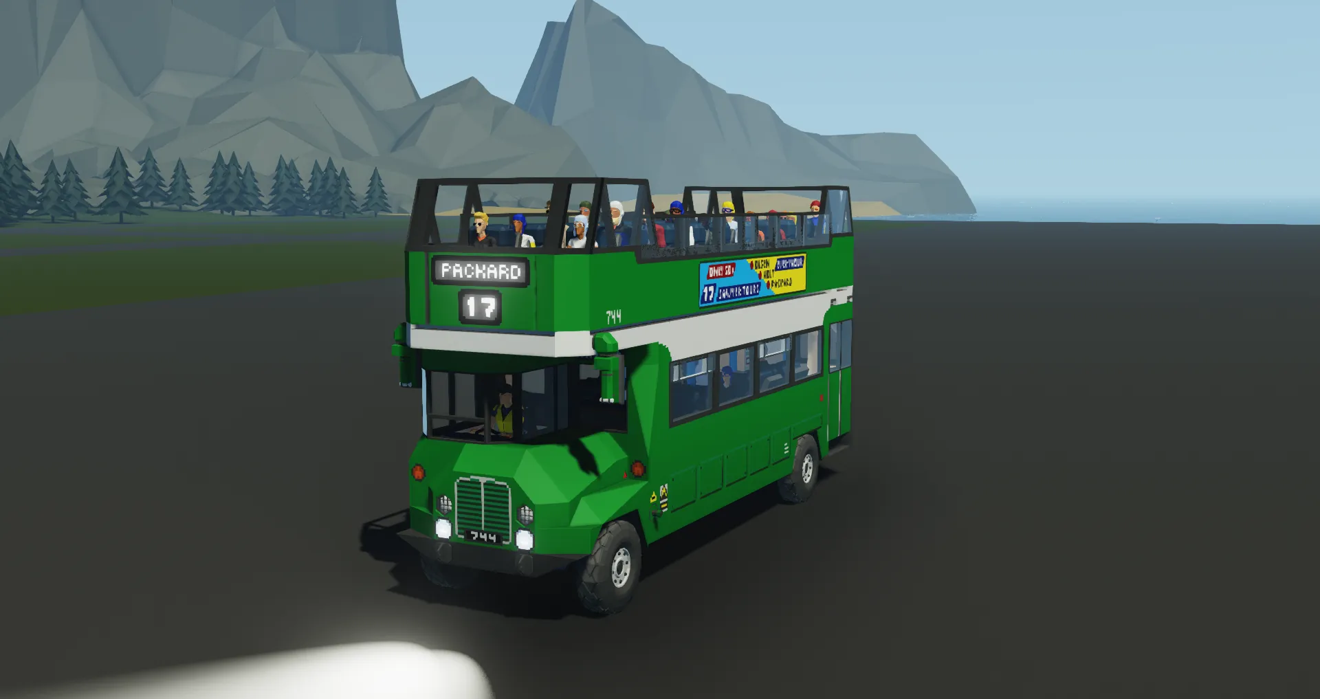 This particular model features an unbranded Green and White livery, common with buses used by National Bus Company subsidiaries in rural areas, with an advertisement for Sightseeing Route 17 between Olsen Bay, Holt Town, and Packard Sawmill.