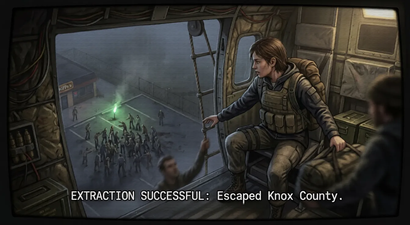 == Escape: Clear the area to safely board the helicopter. Your character's survival stats will be recorded as a victory.