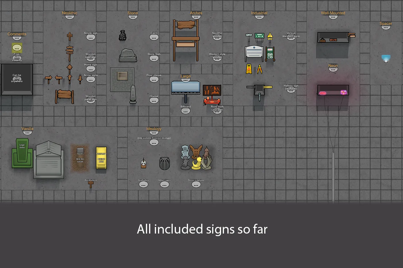 The core focus of this mod is the Comment, but I always like to decorate my colonies and thought some decorative signs would be fun to play with as well. I tried to cover the gamut of possible signs I could think of, but I am open to suggestions for more signs to add in future updates. I may also make modular additions with more signs related to specific themes in the future.