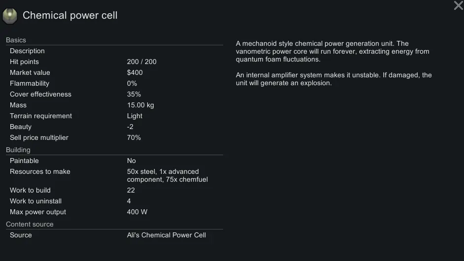Adds a buildable version of the unstable power cell. Does not require fuel, and gives of a stable 400kw.