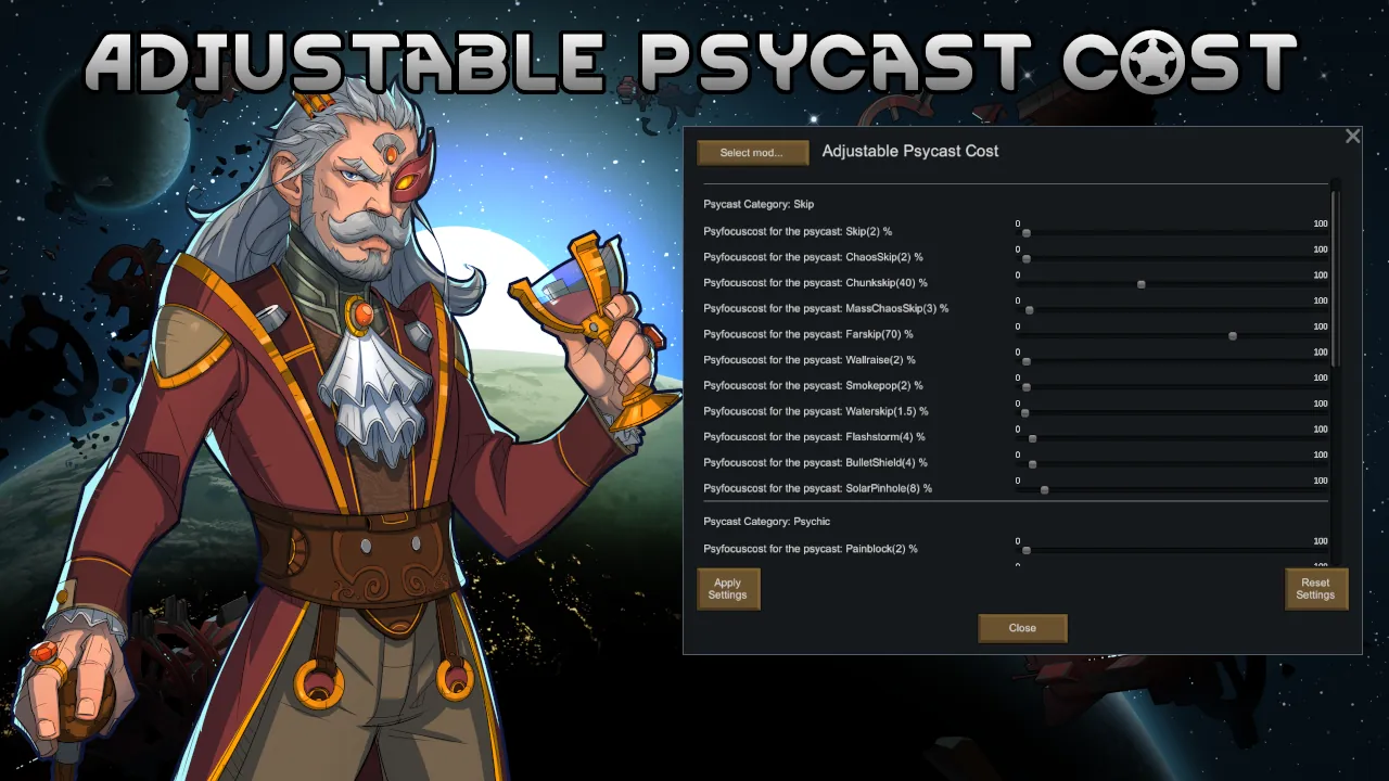 This mod adds sliders in the mod setting menu to adjust the psyfocus cost of vanilla psycasts.
