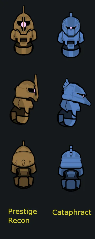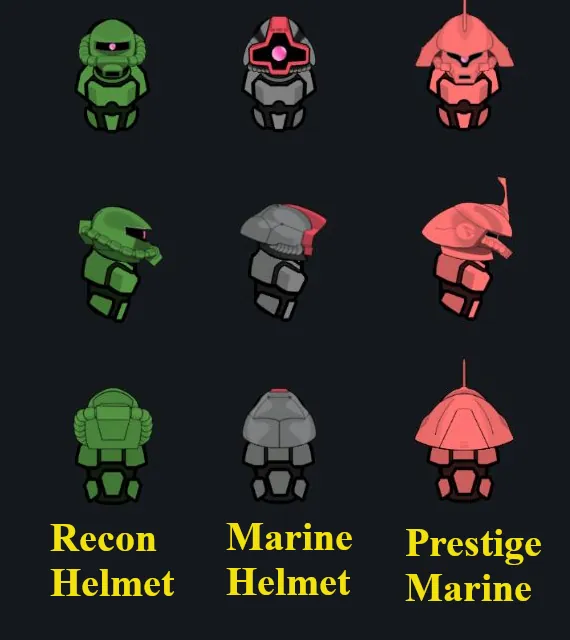 This mod adds a Zeon style category that reskins the vanilla Recon, Marine, and if you have Royalty the Prestige Marine helmet to resemble the head of iconic Mobile Suits from Mobile Suit Gundam and and Mobile Suit Zeta Gundam.