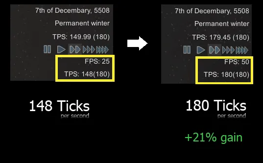 a totally new system for ticking jobs, this reduces the pawns scanning for jobs, instead they will only scan when they complete a job and/or after 3secs. Some activities like Sleeping, Healing, Wandering and "Going to" have been throttled massively, they represent about 80% of all ticking. This is by far the biggest contributor to performance and can reach up to 50% performance increase compared to vanilla.