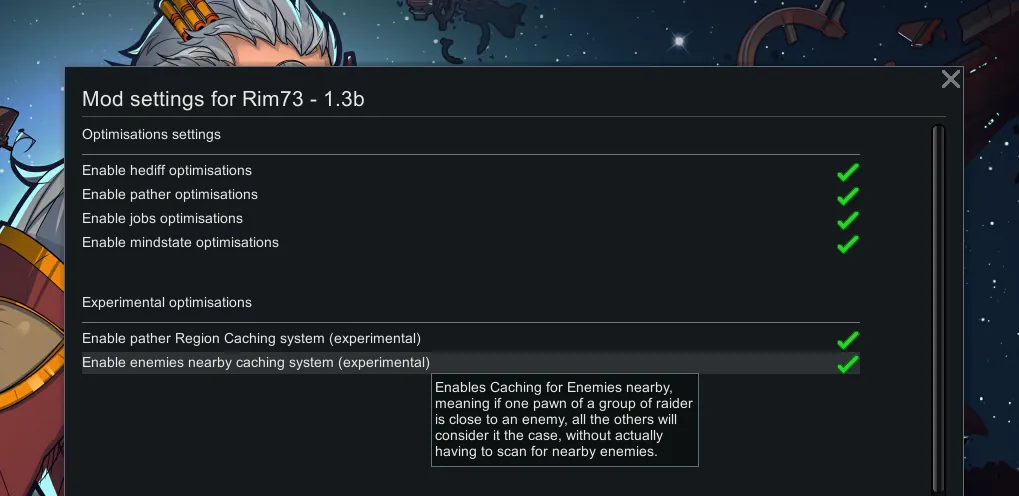 The performance comparisons were made on a 60 days colony with 5 active pawns, your mileage may vary, the columns Vanilla time in ms and Rim73 time in ms, represents the time of execution.