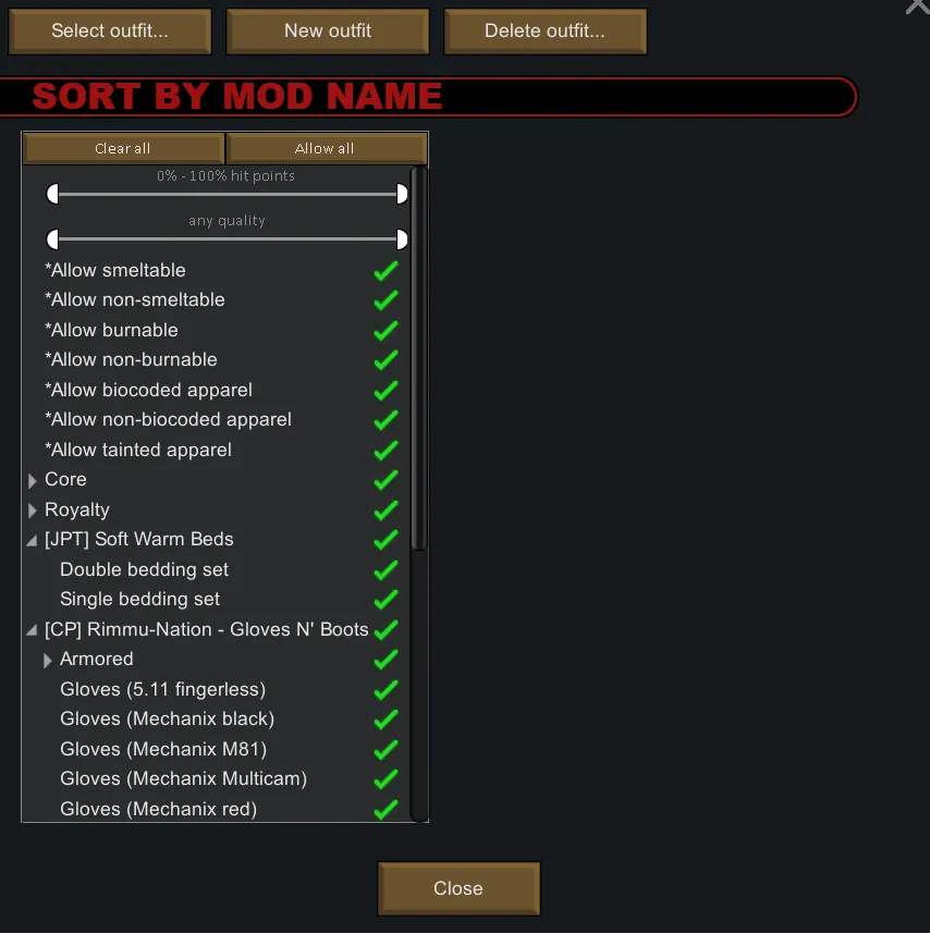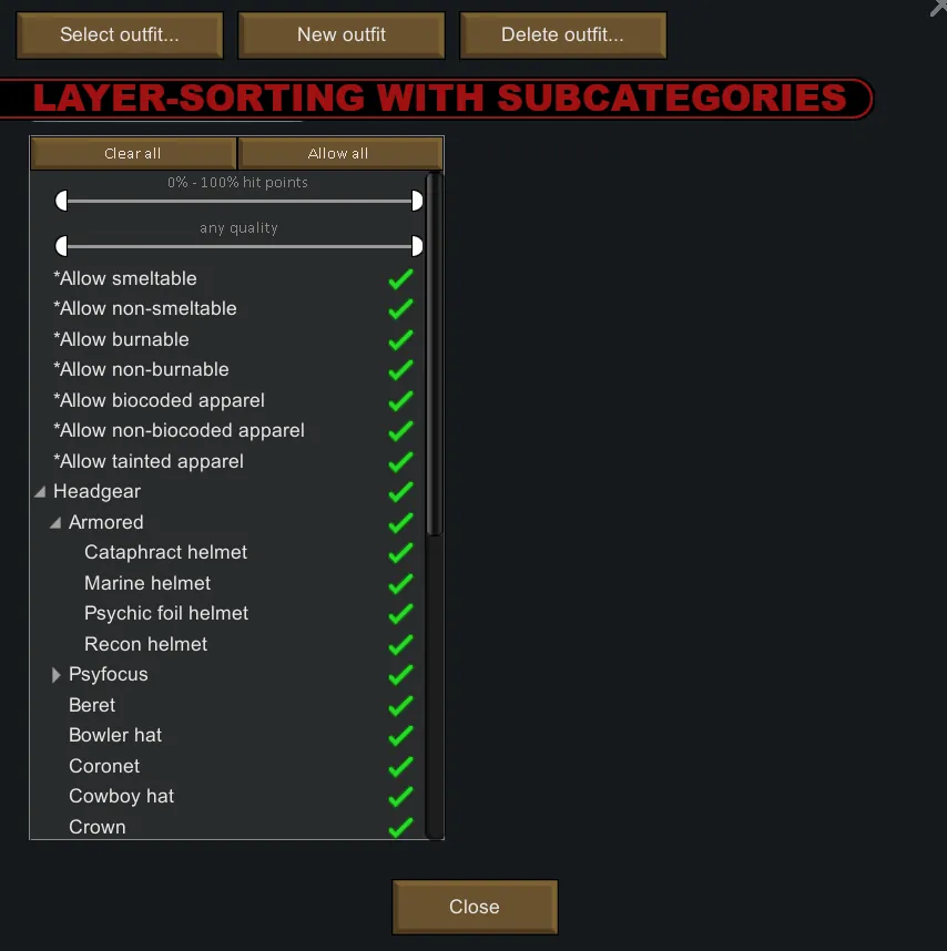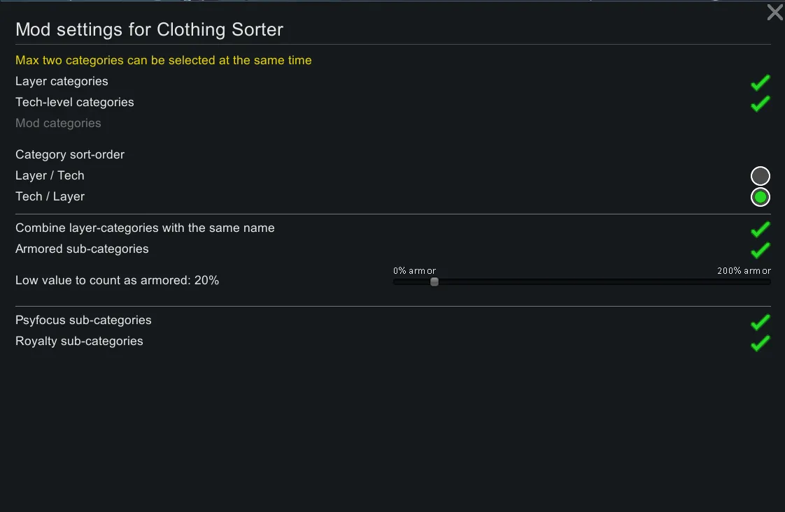 [*] Options for subcategories based on armor-value and Psycic/Royalty-tagged apparel