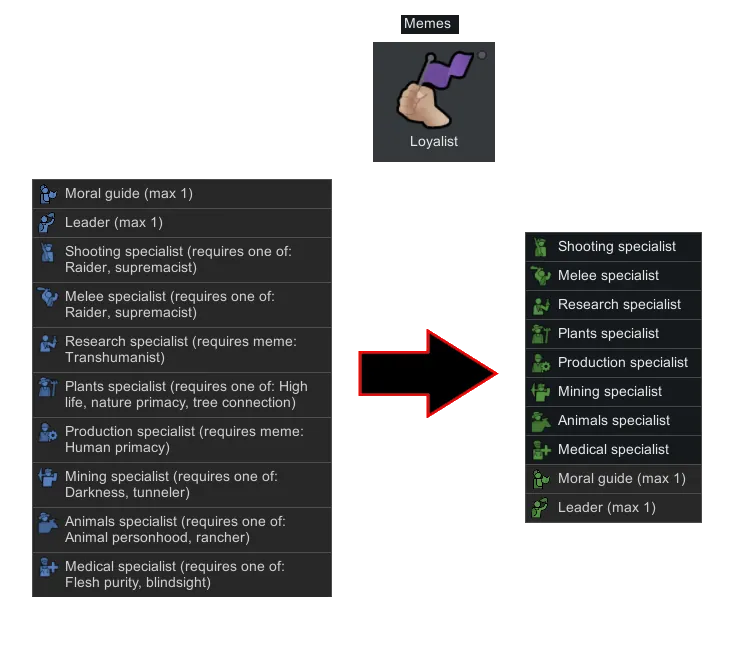 Simple mod that untied specialist roles from memes. Allows player choose any two specialist role for custom ideology without dev mod enabled. Work only for "vanila" roles like : Production, Mining, Research, etc specialists.