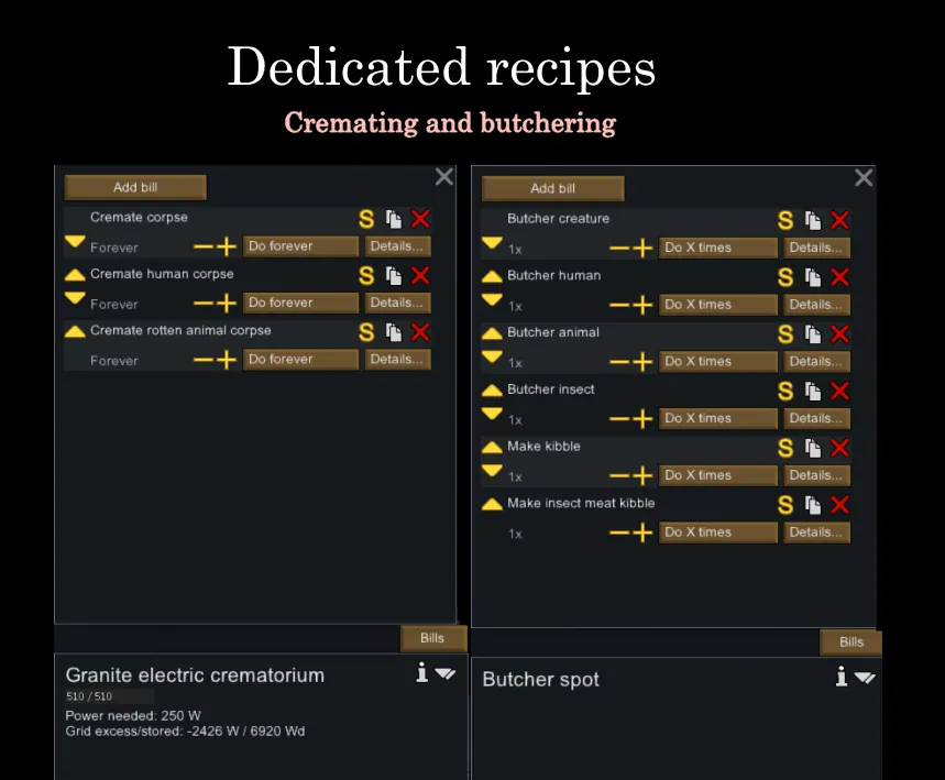 This QoL mod breaks cremating and butchering recipes down into dedicated recipes for animals, humans and insects.