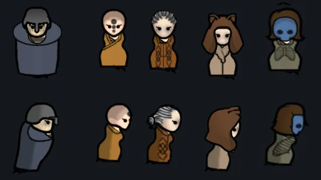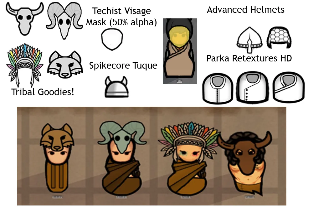 1.0 Parkas for Morbid, Christian, Hindu, Islamic, Buddhist, Totemic, Spacer, Animalist. Bonus: Animalist Hood, Visage Mask for Morbid, Christian Flack Helmet (kinda knight looking).