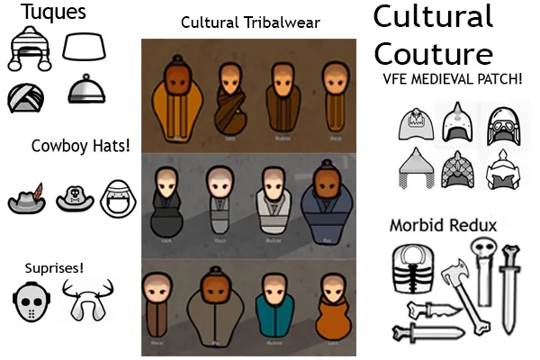 1.4 Patches for VFE: Medieval (Light Plate Helmets), unique tribalwear for Buddhist, Christian, Hindu and Islamic. Lots of hats (Tuque, Cowboy Hat, new War Mask and Hood). Texture improvements to all my morbid stuff and the Buddhist Longsword.