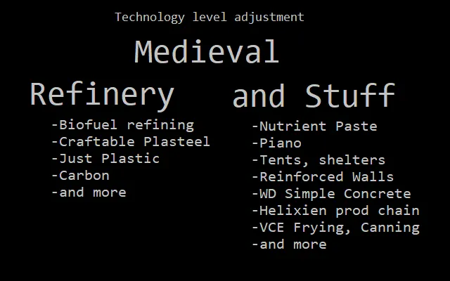 Just a simple patch mod that moves Biofuel Refinery and a bunch of other things to medieval tech level. Good for tech limited runs where you want it for that alchemy/steampunk/dieselpunk vibe.