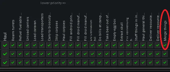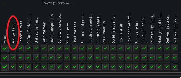 Changes the priority of merging stacks to be done first before all the other hauling jobs. If you have a large base and multiple stockpiles this may delay your normal operations until things are merged but once it's all merged the upkeep should be minimal.