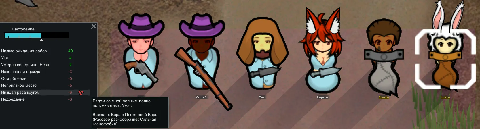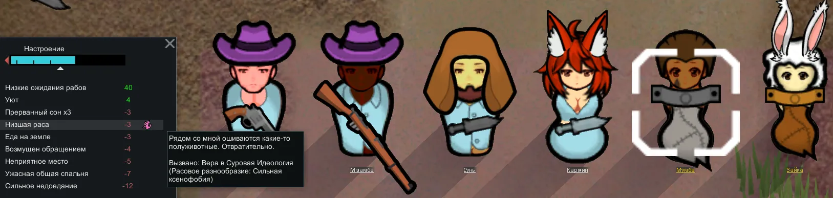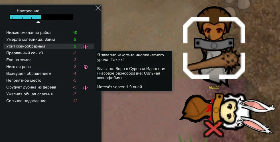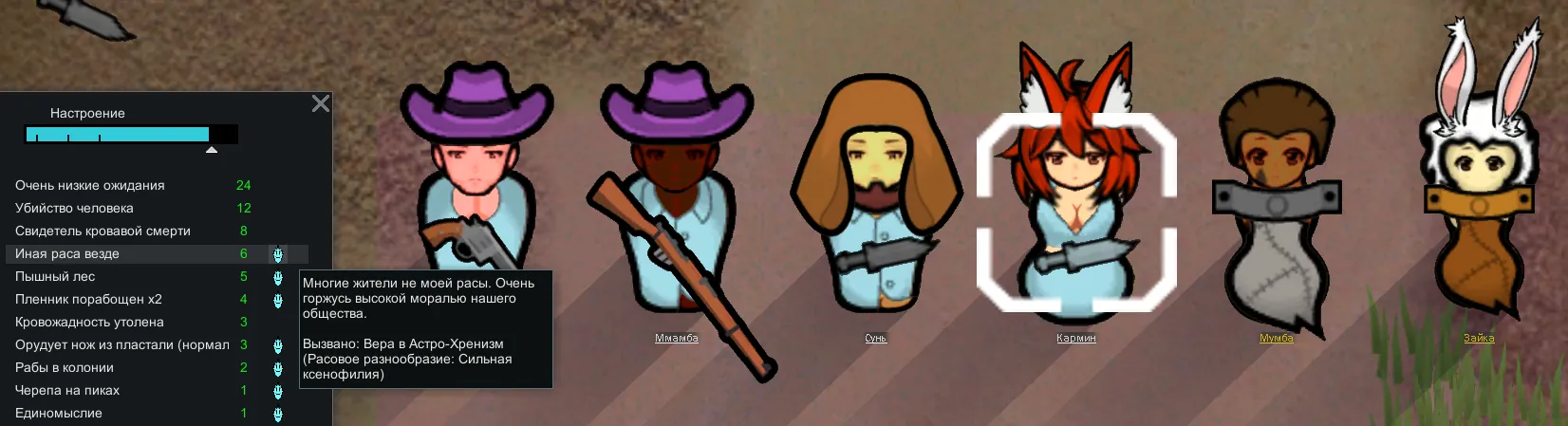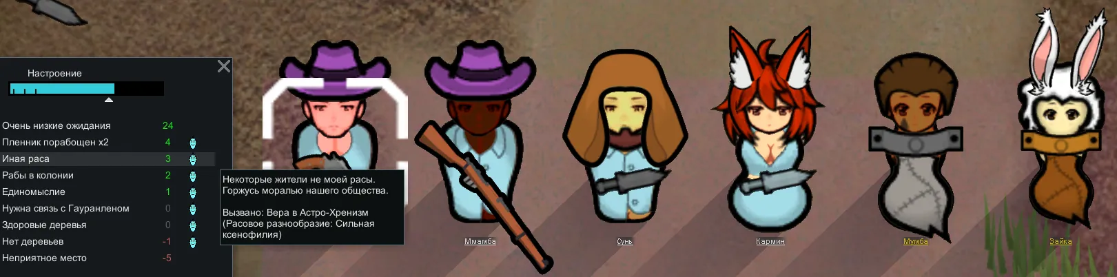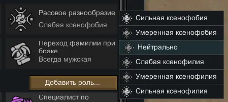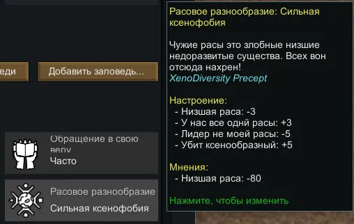 При создании идеологии можно установить для адептов режим ксенофобии или ксенофилии разной степени. В результате отношения между колонистами и их настроение будет зависеть от расовой однородности населения.